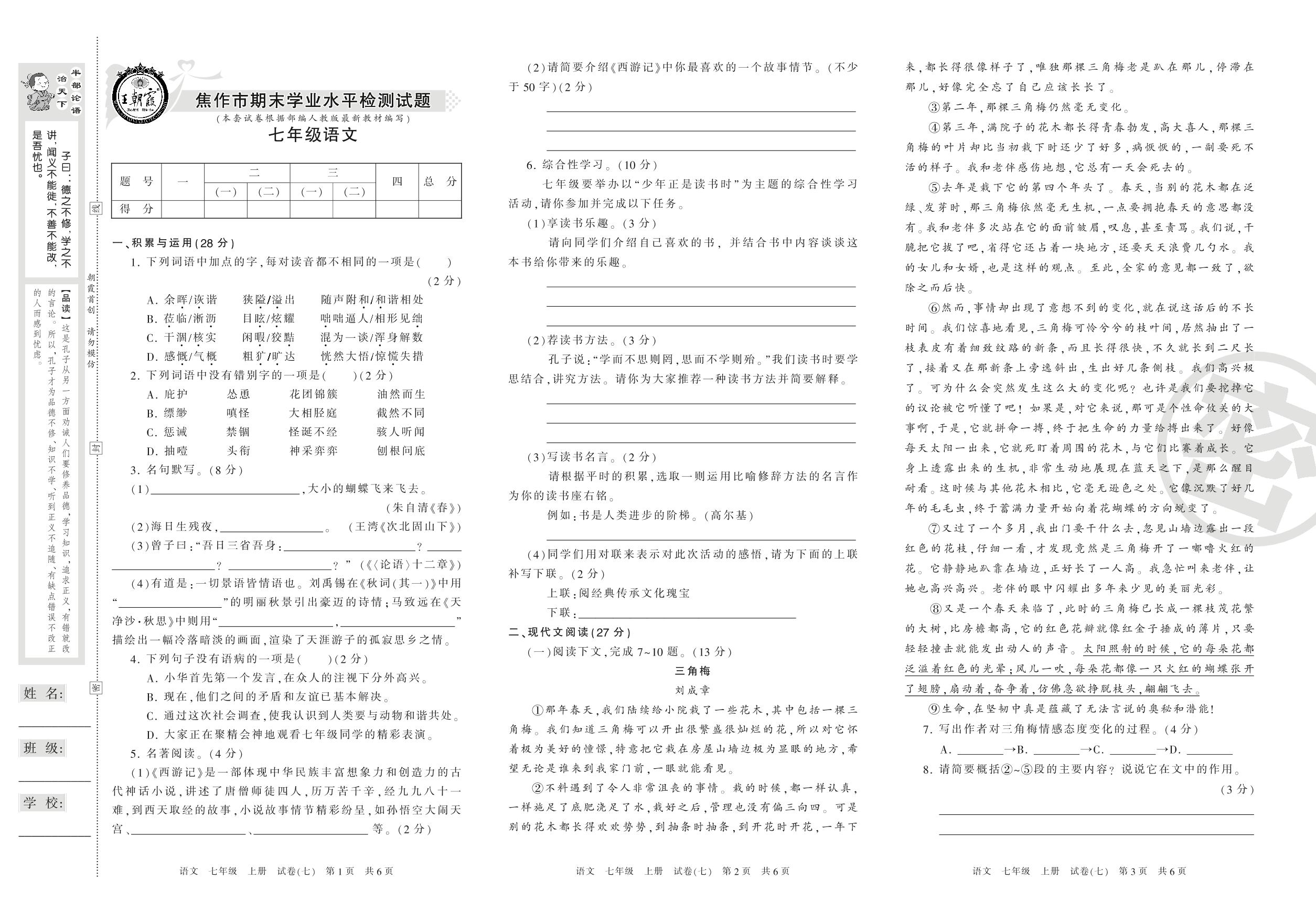 2016-2017学年第一学期焦作市七年级语文试卷(人教版)【7】