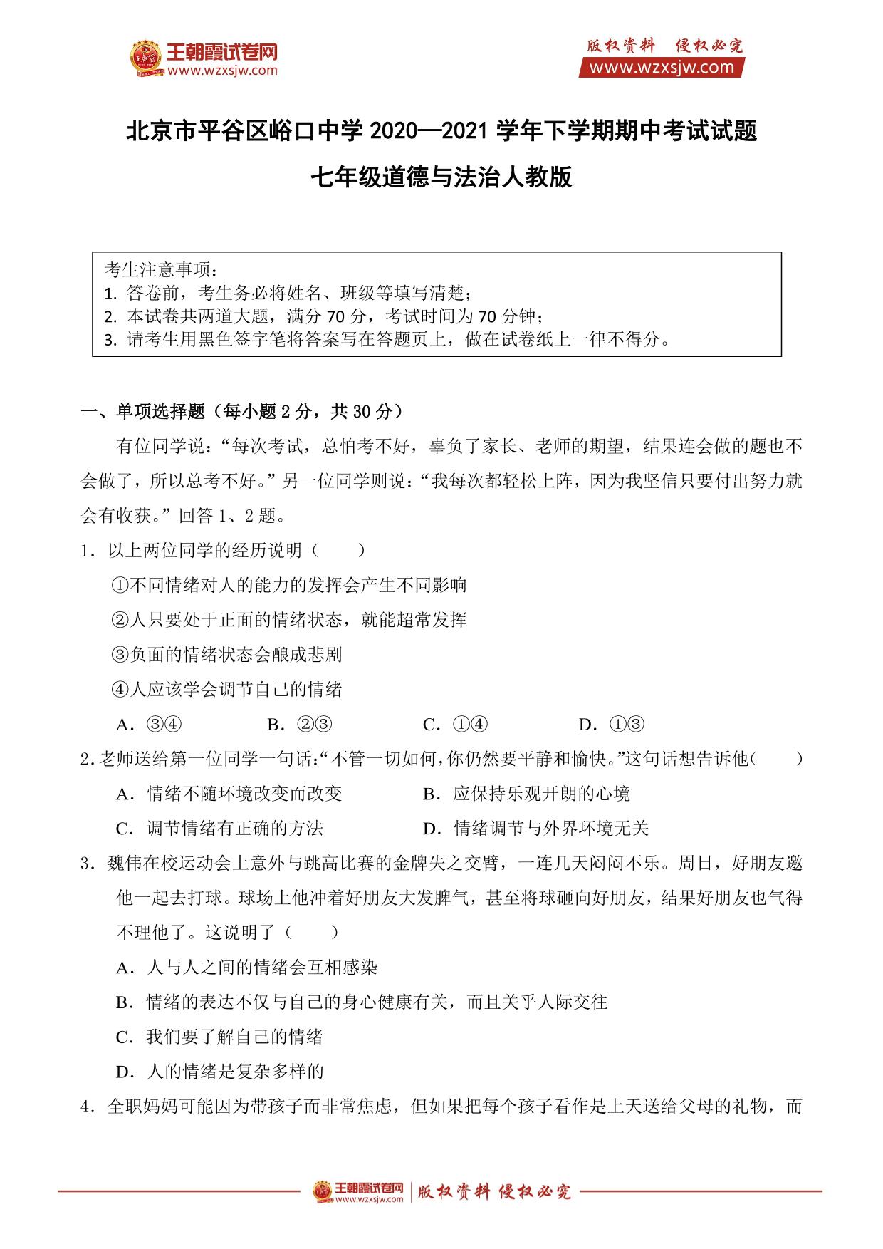 北京市平谷区峪口中学2020-2021学年下学期期中考试试题七年级道德与法治(人教版)