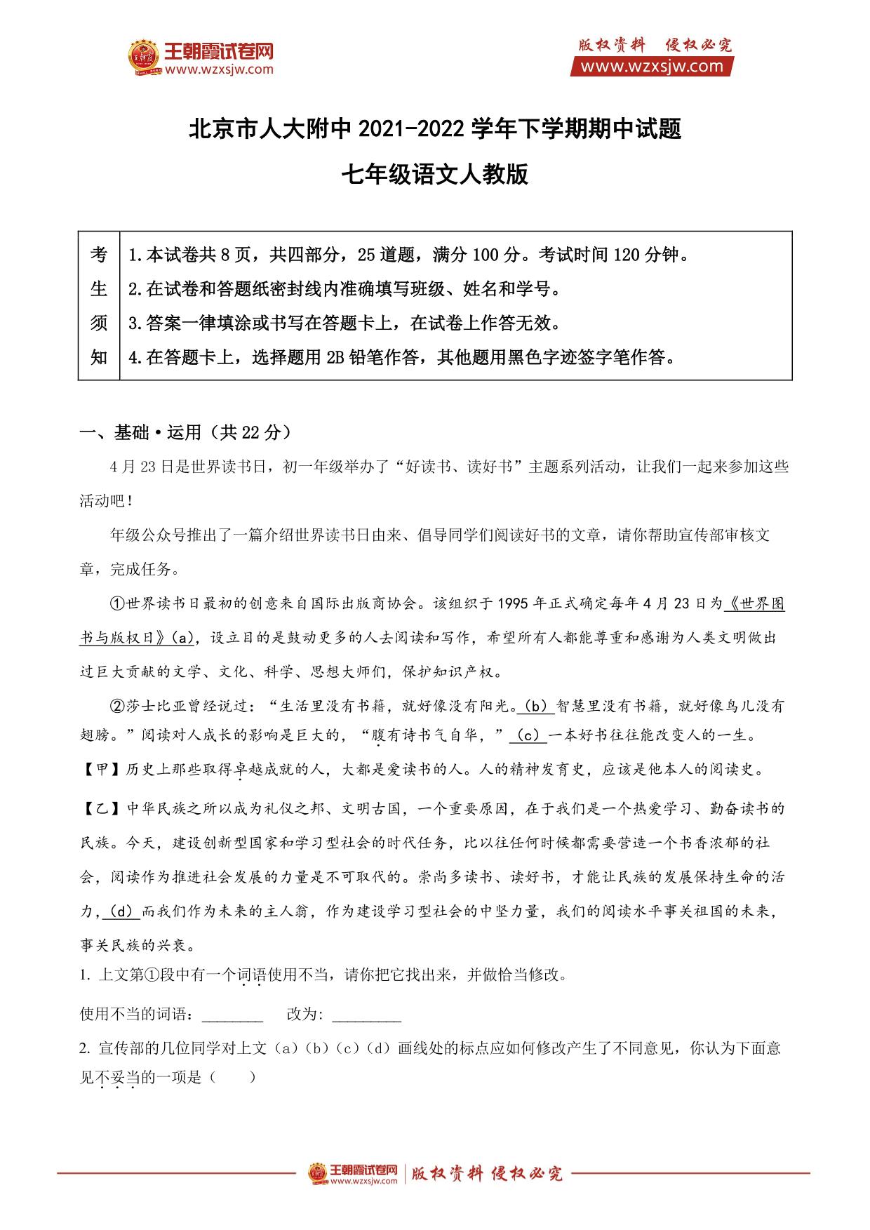 北京市中国人民大学附属中学2021-2022学年下学期期中试题七年级语文(人教版)