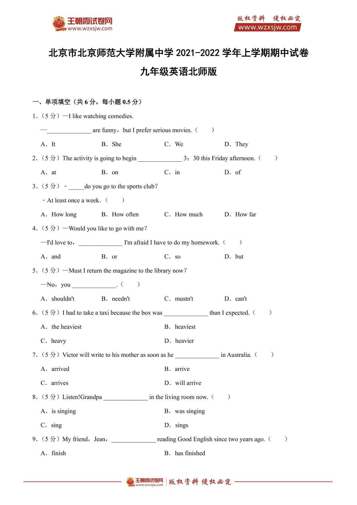 北京市北京师范大学附属中学2021-2022学年上学期期中试卷九年级英语(北师版)【无听力音频】