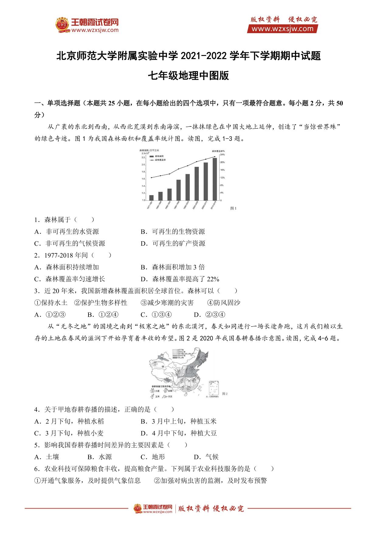 北京市北京师范大学附属实验中学2021-2022学年下学期期中试题七年级地理(中图版)
