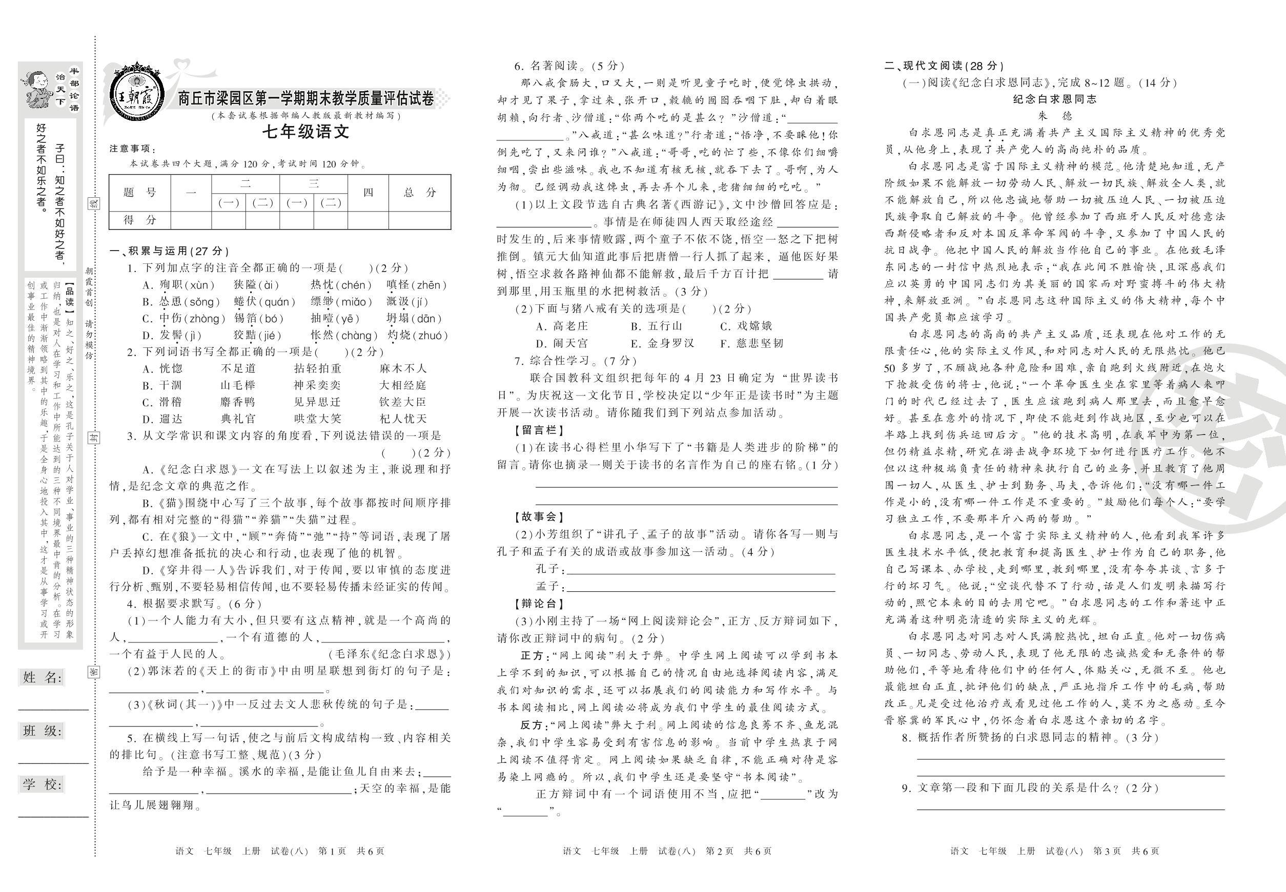 2016-2017学年第一学期商丘市七年级语文试卷(人教版)【8】