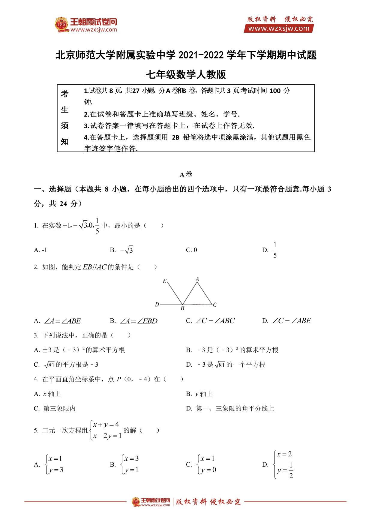 北京市北京师范大学附属实验中学2021-2022学年下学期期中试题七年级数学(人教版)