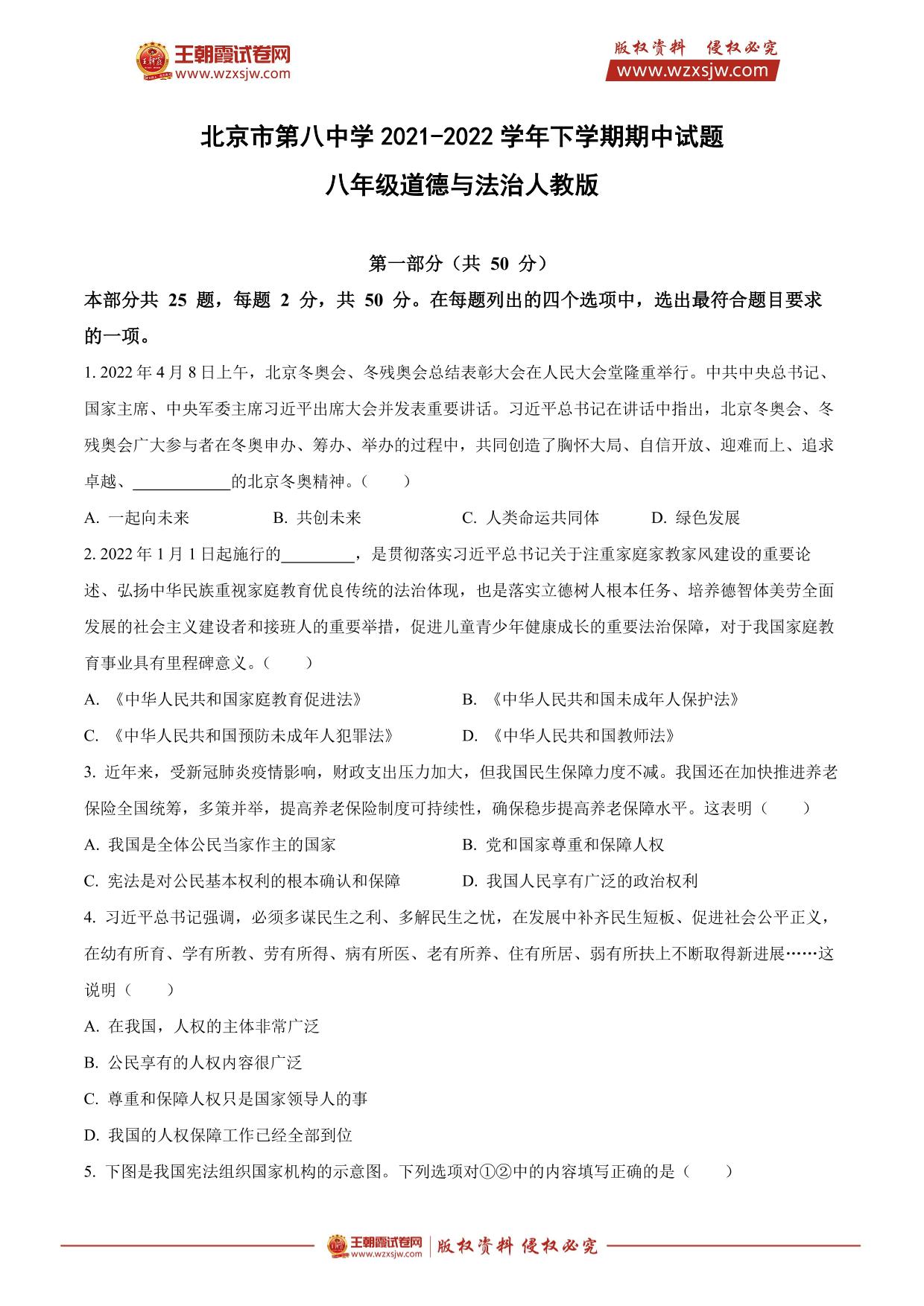 北京市第八中学2021-2022学年下学期期中试题八年级道德与法治(人教版)