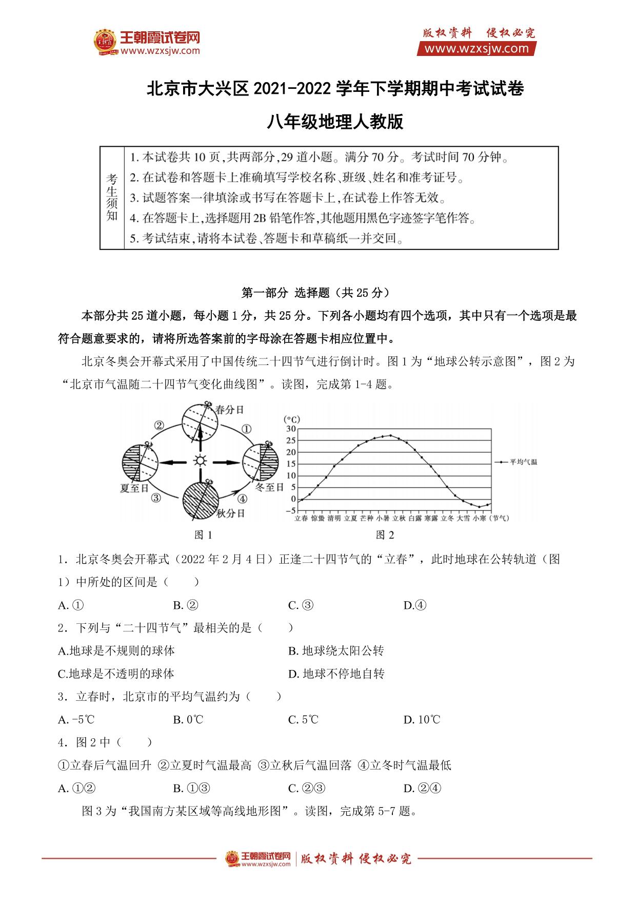 北京市大兴区2021-2022学年下学期期中考试试卷八年级地理(人教版)