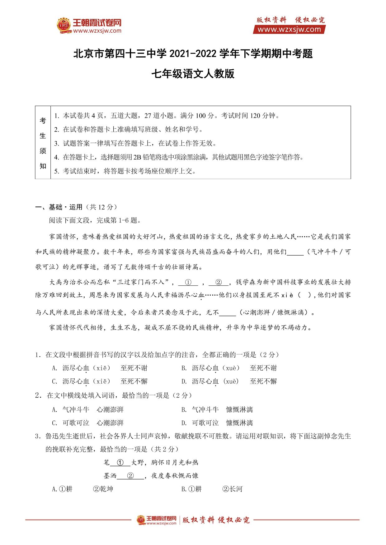 北京市第四十三中学2021-2022学年下学期期中考试试题七年级语文(人教版)