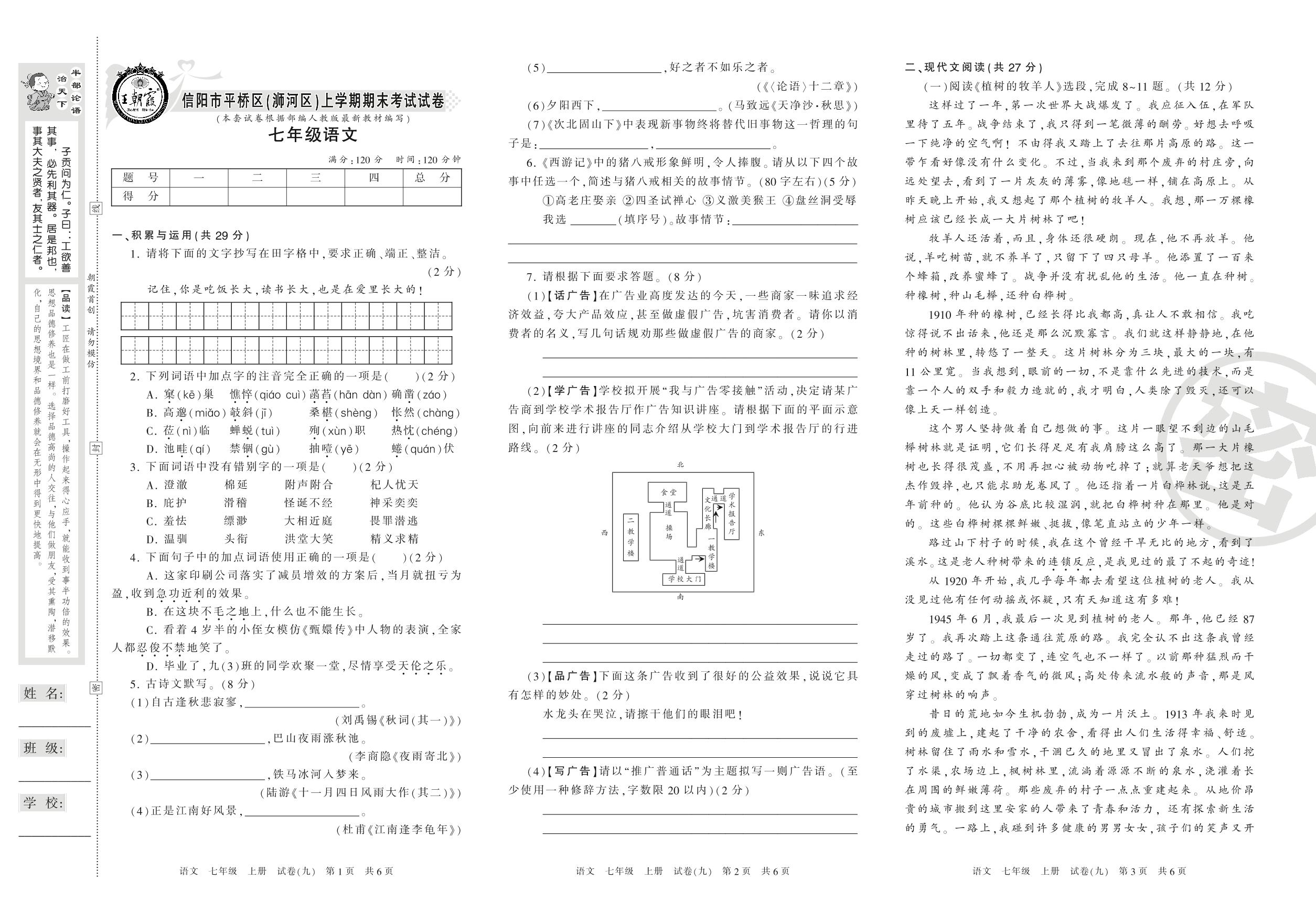 2016-2017学年第一学期信阳市平桥 浉河区七年级语文试卷(人教版)【9】