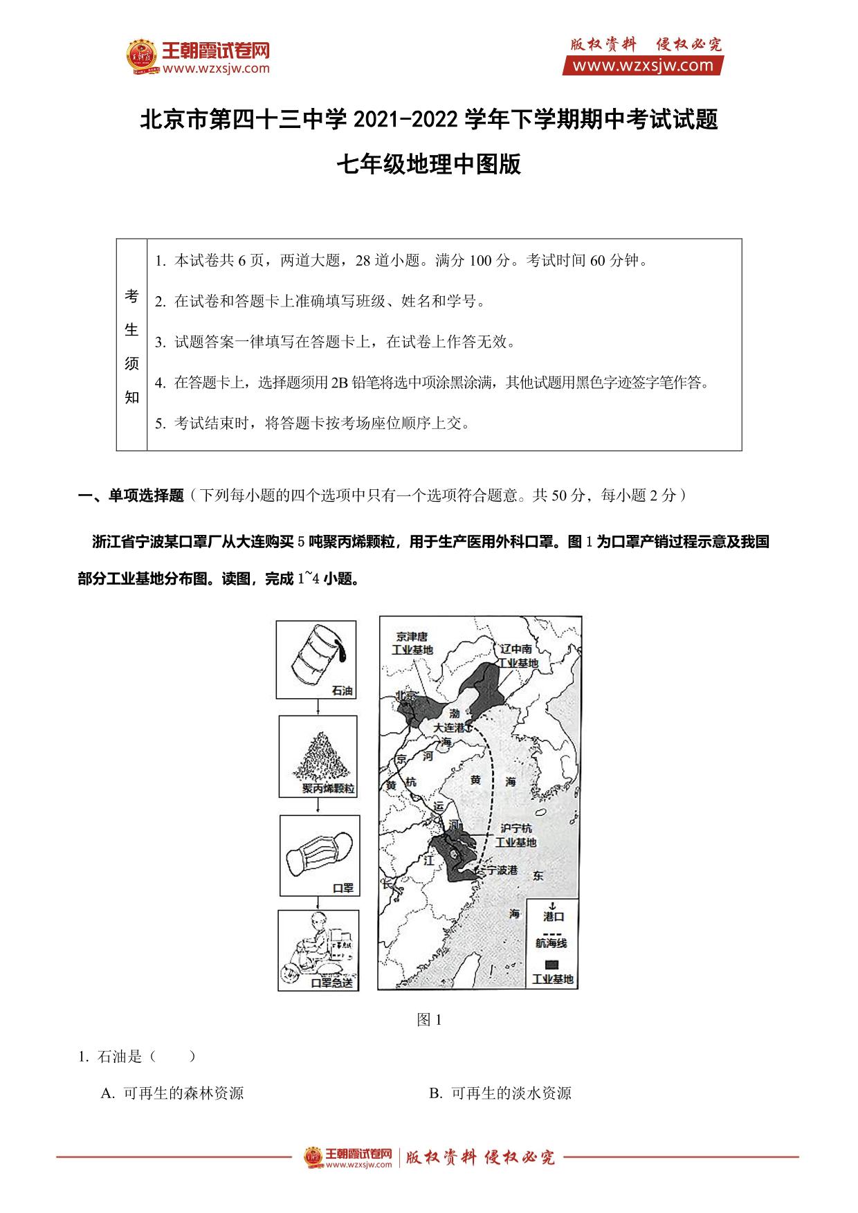 北京市第四十三中学2021-2022学年下学期期中考试试题七年级地理(中图版)