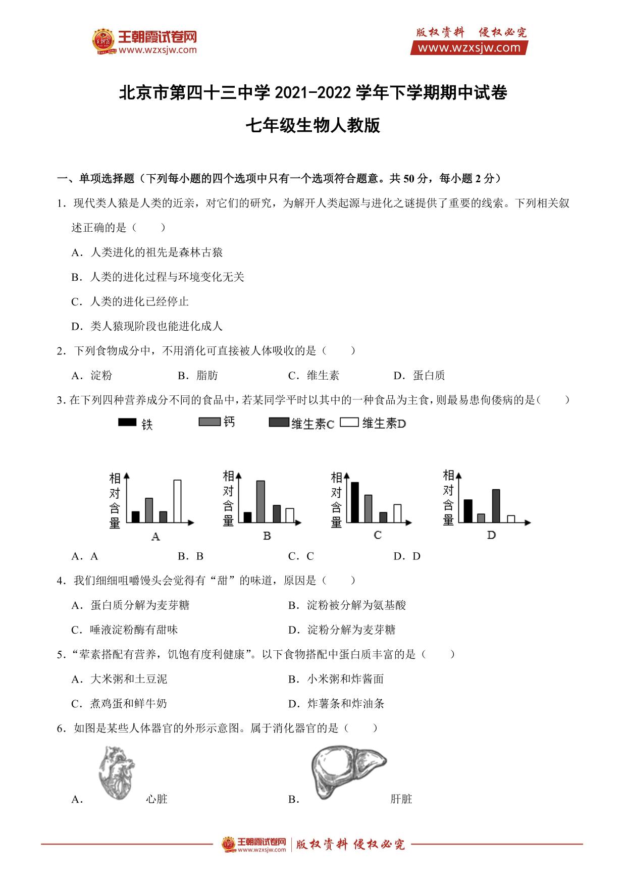 北京市第四十三中学2021-2022学年下学期期中试卷七年级生物(人教版)