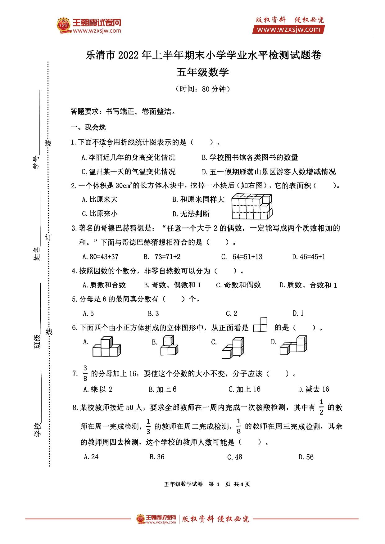 浙江省温州市乐清市2021-2022学年下学期期末教育质量监测五年级数学(人教版)