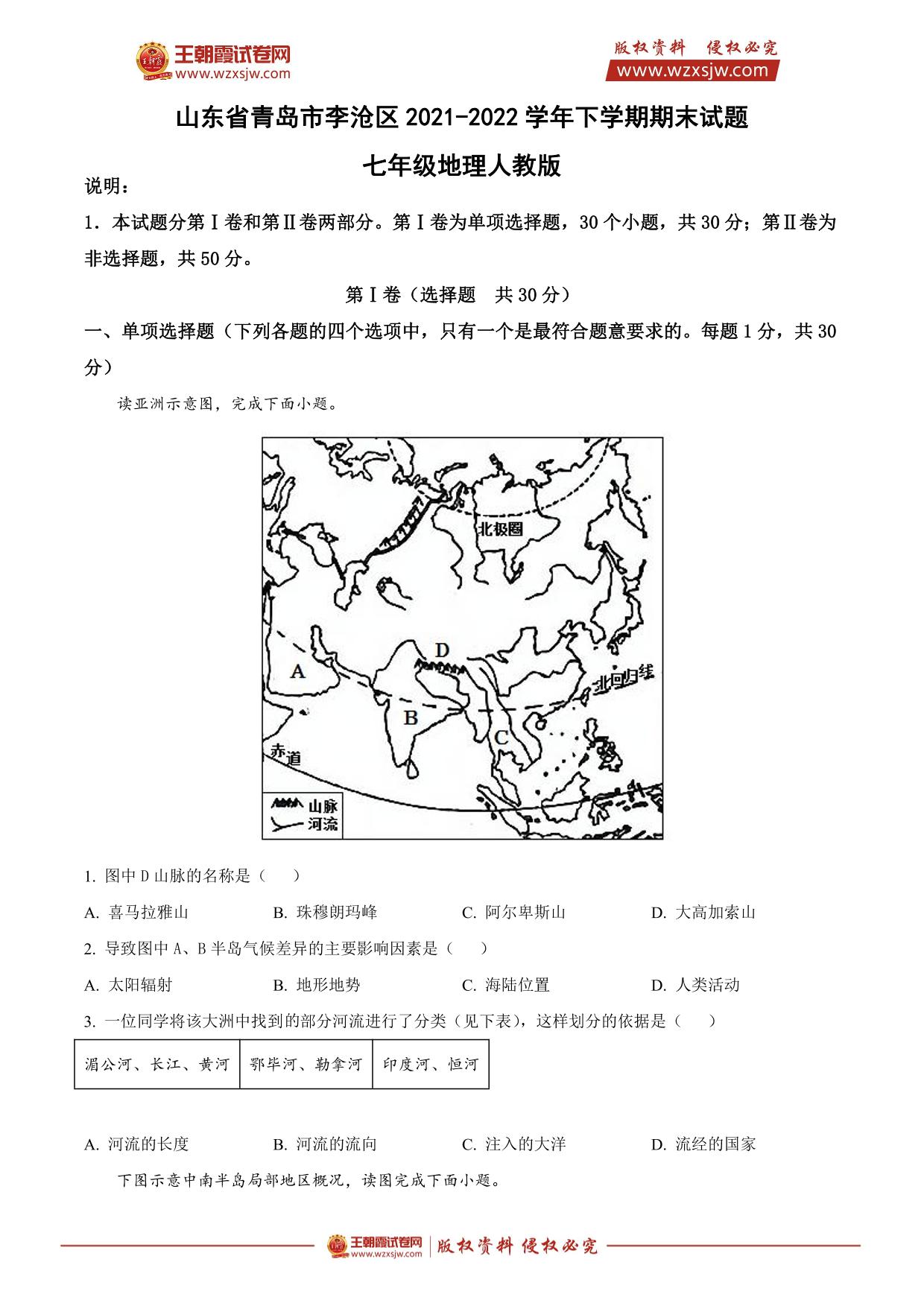 山东省青岛市李沧区2021-2022学年下学期期末试题七年级地理(人教版)