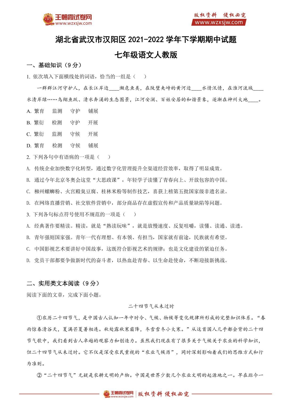 湖北省武汉市汉阳区2021-2022学年下学期期中试题七年级语文(人教版)