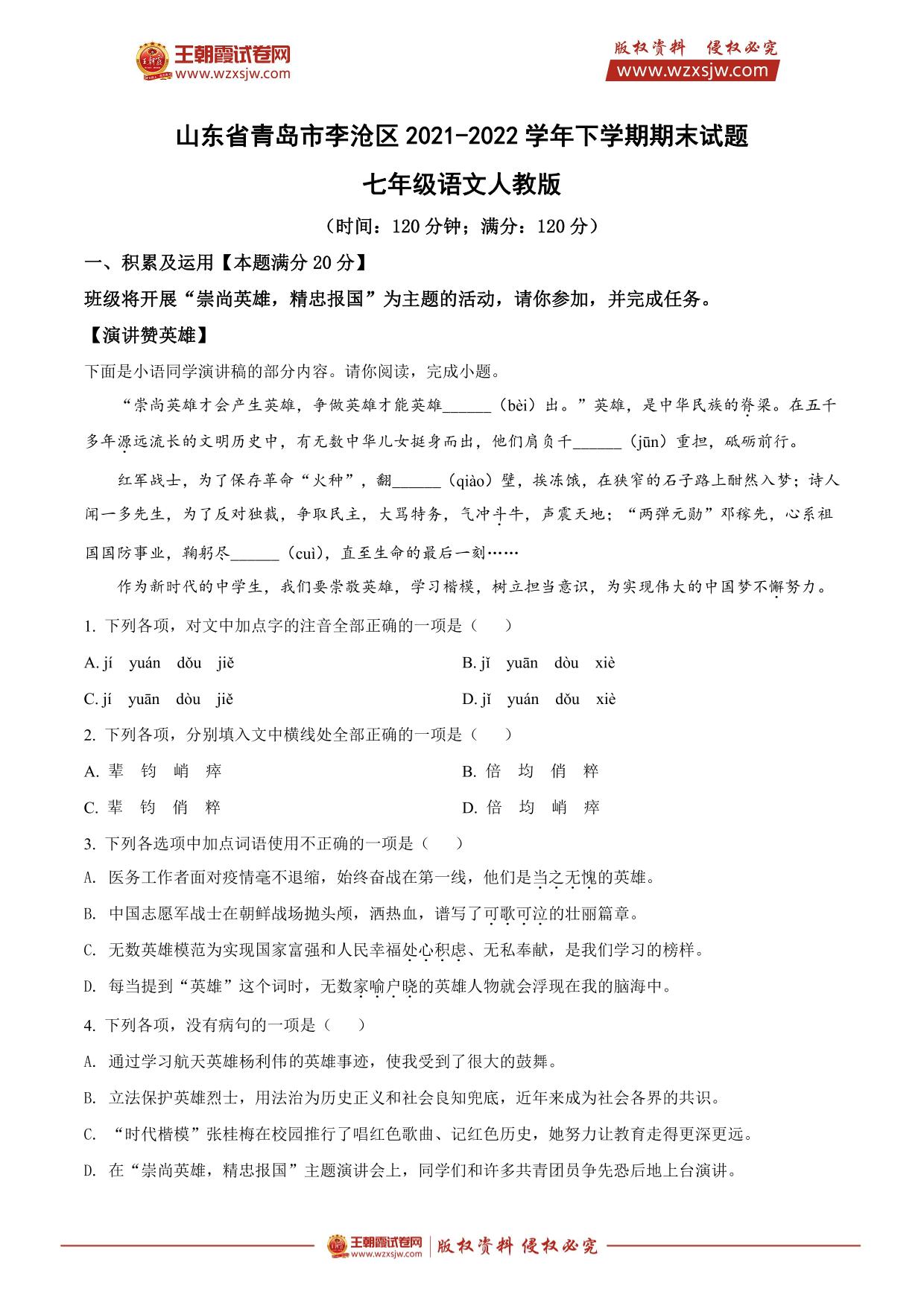 山东省青岛市李沧区2021-2022学年下学期期末试题七年级语文(人教版)