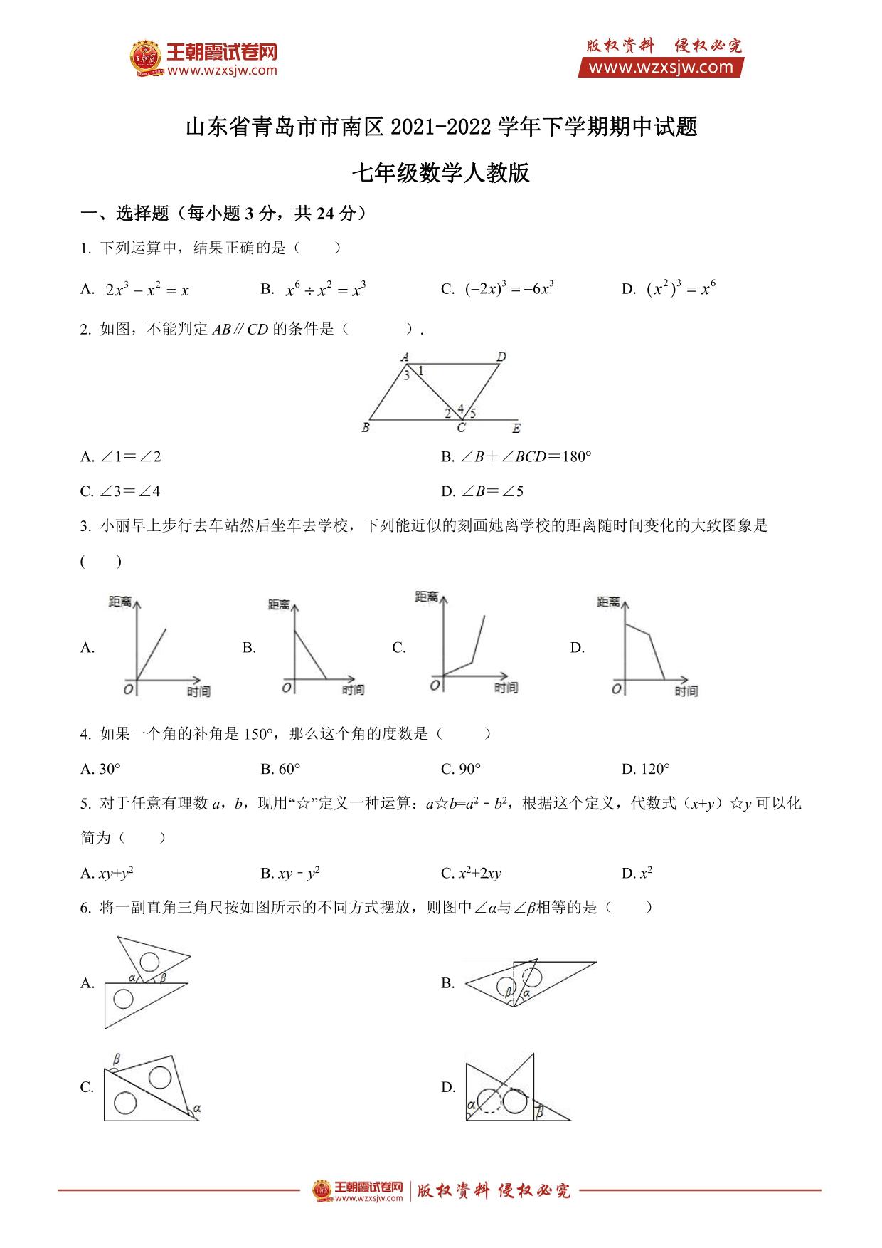 山东省青岛市市南区2021-2022学年下学期期中试题七年级数学(人教版)