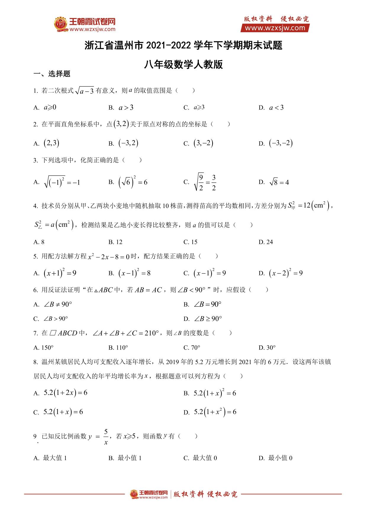 浙江省温州市2021-2022学年下学期期末试题八年级数学(人教版)