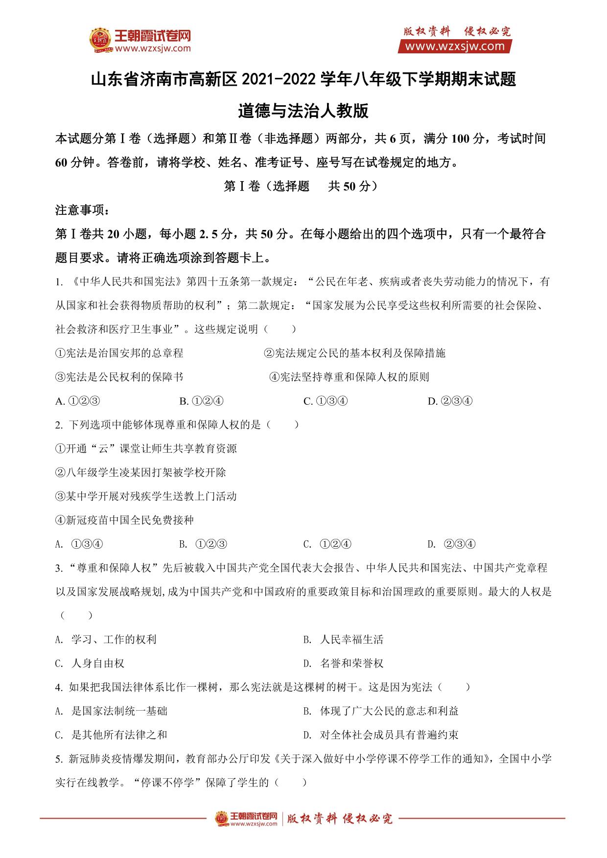 山东省济南市高新区2021-2022学年下学期期末试题八年级道德与法治(人教版)