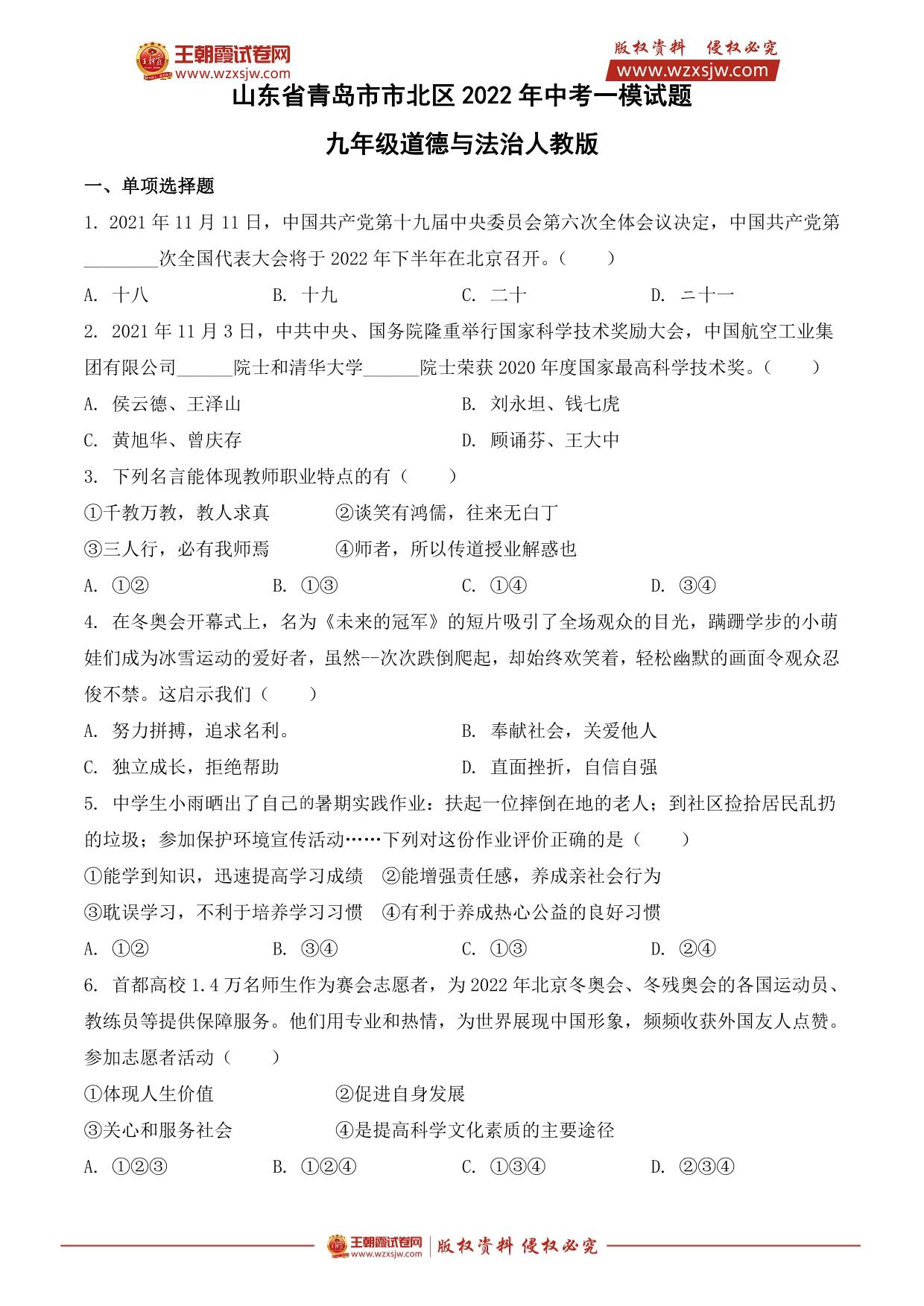 山东省青岛市市北区2022年中考一模试题九年级道德与法治(人教版)