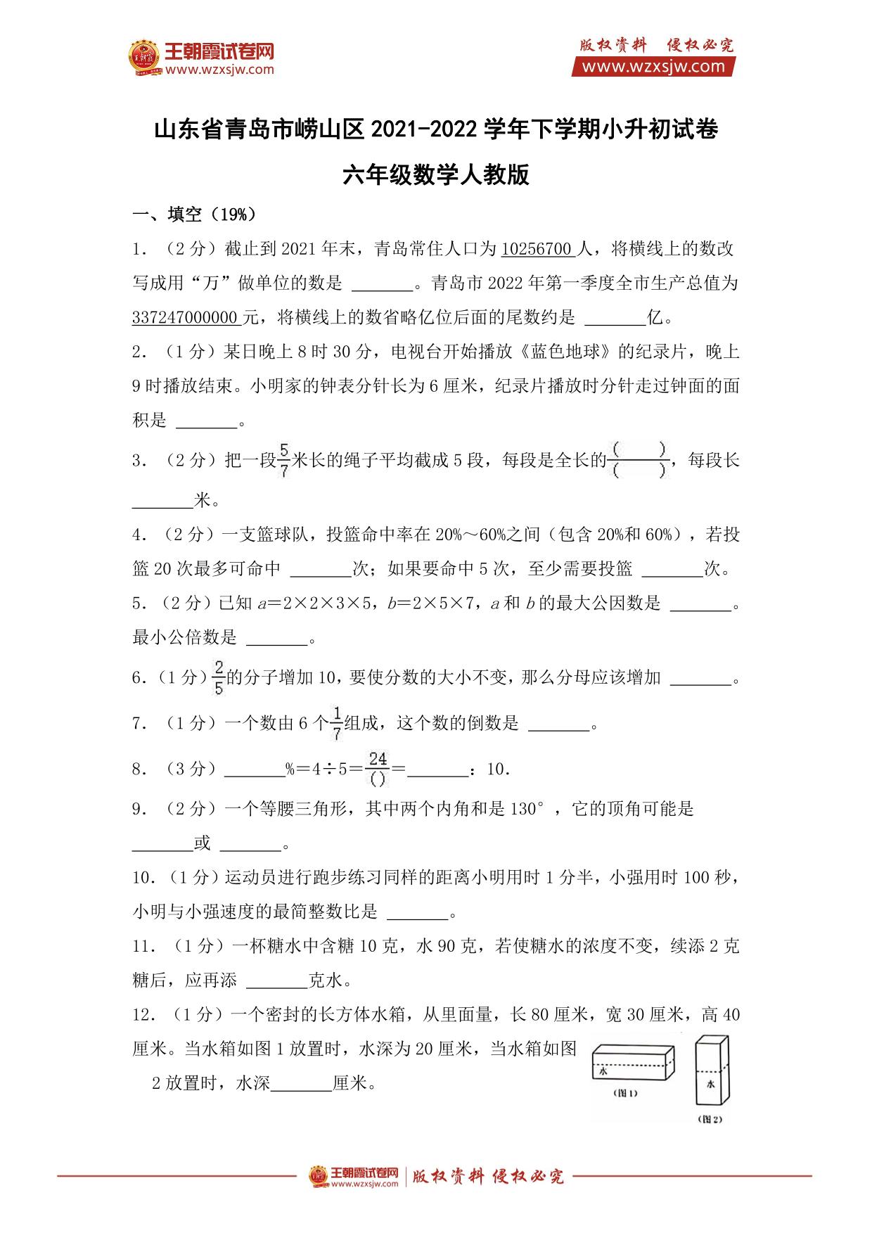 山东省青岛市崂山区2021-2022学年下学期小升初试卷六年级数学(人教版)