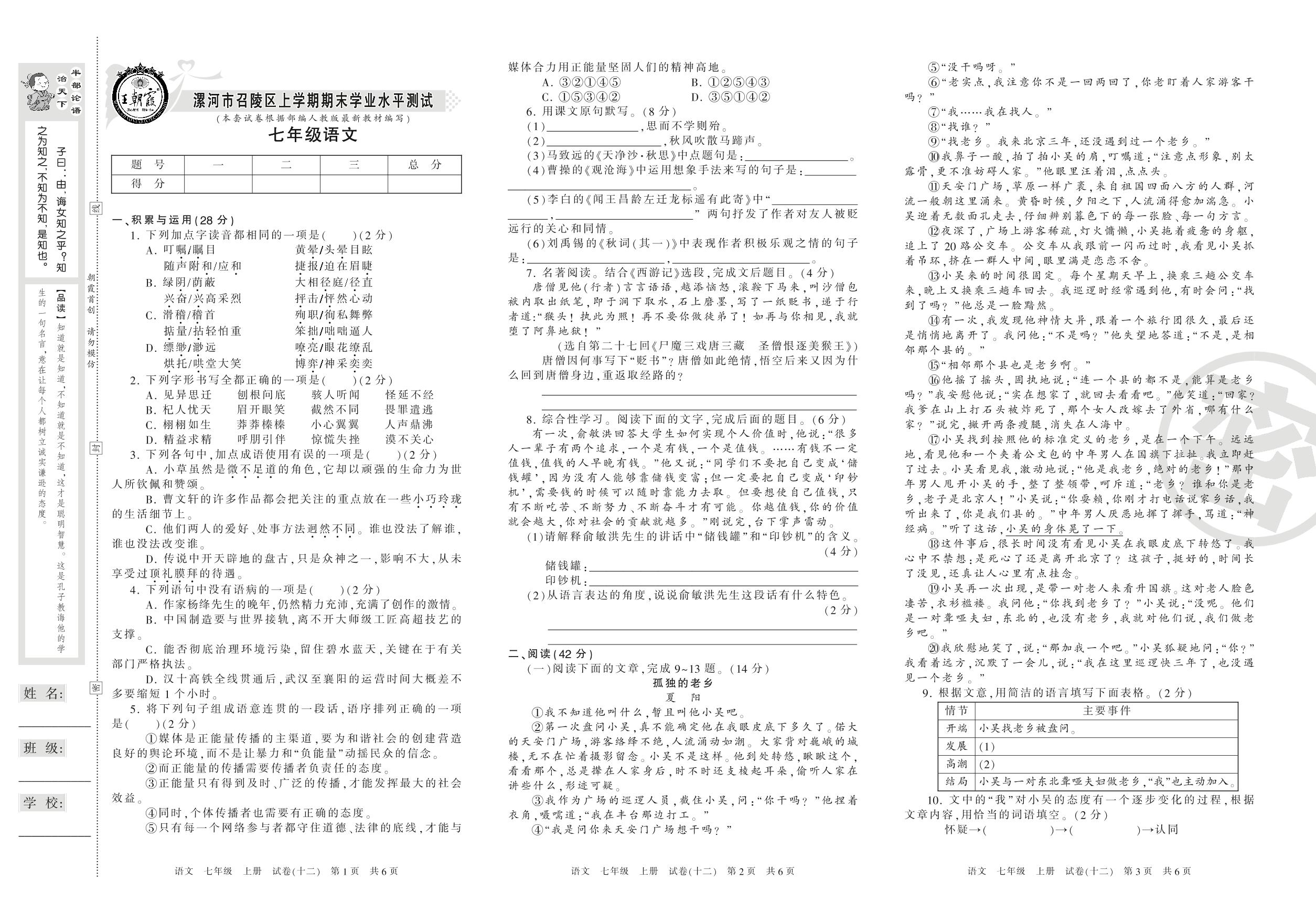 2016-2017学年第一学期漯河市召陵区七年级语文试卷(人教版)【12】