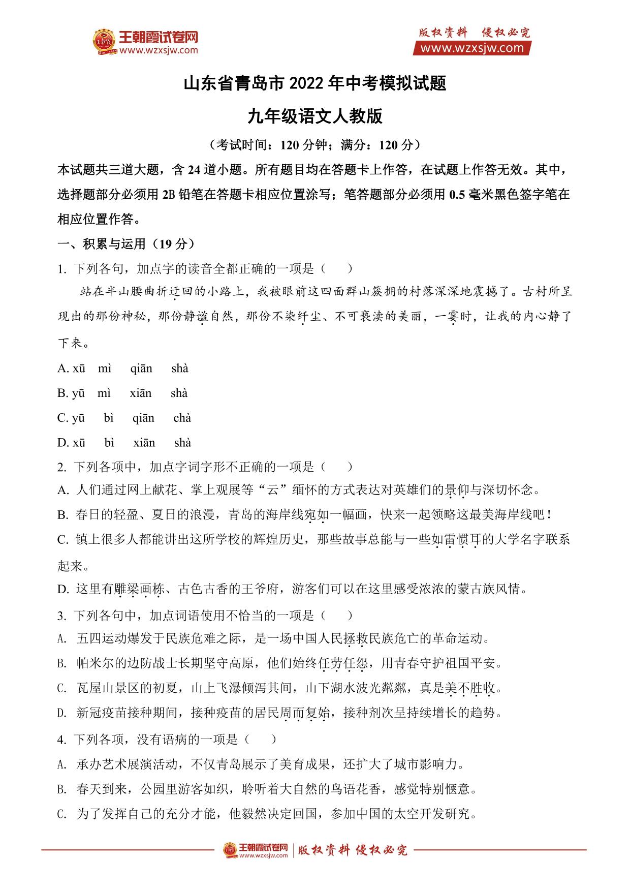 山东省青岛市2022年中考模拟试题九年级语文(人教版)