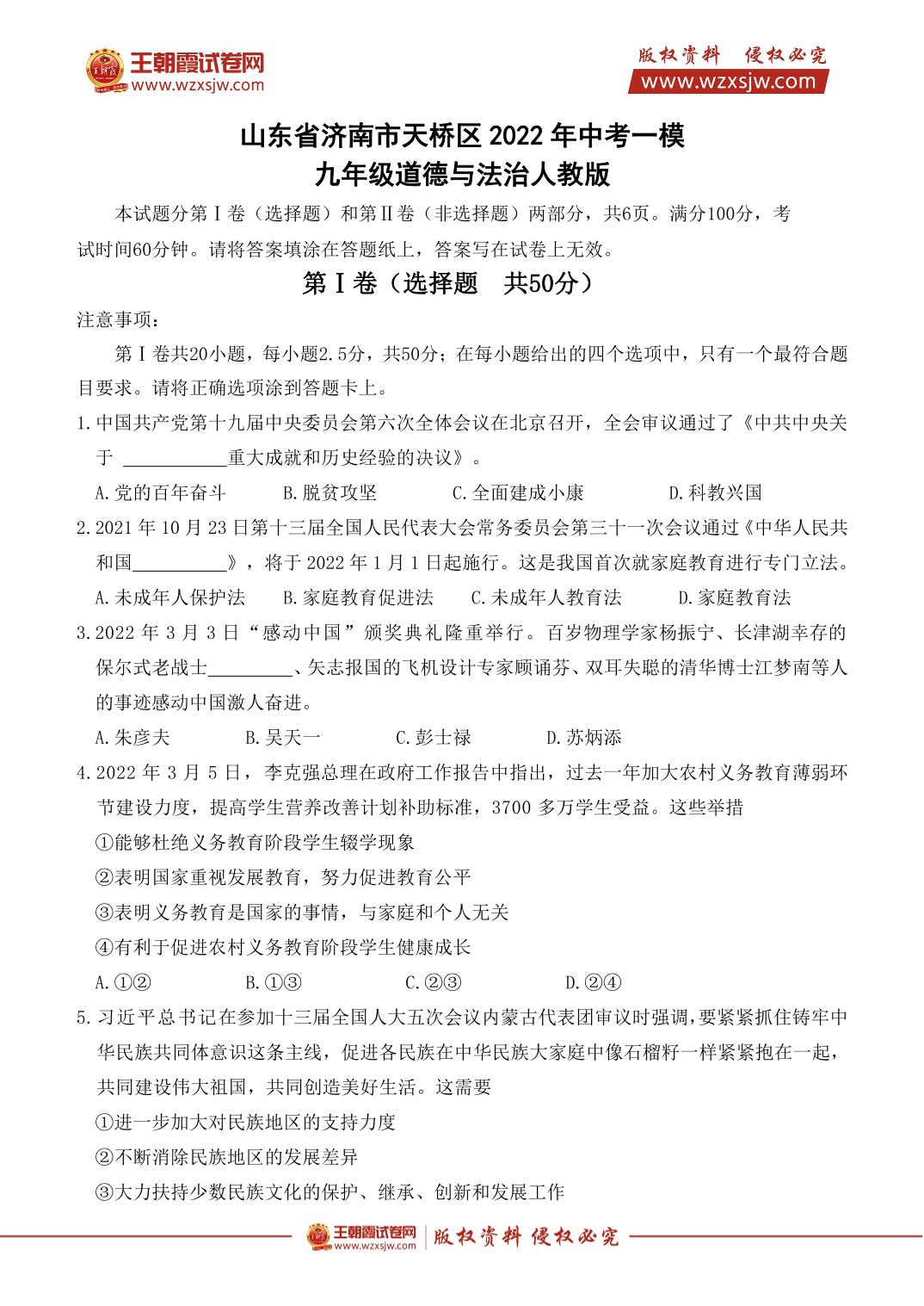 山东省济南市天桥区2022年中考一模九年级道德与法治(人教版)