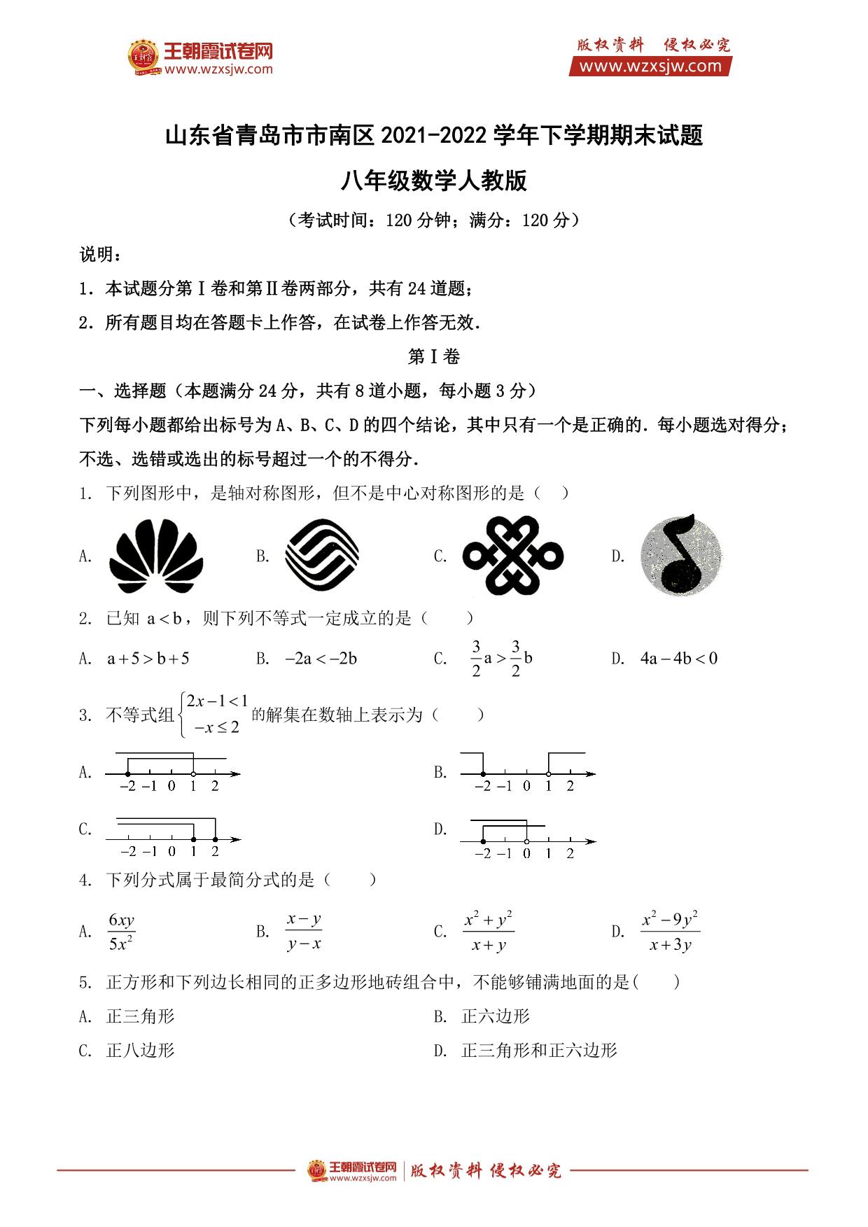 山东省青岛市市南区2021-2022学年下学期期末试题八年级数学(人教版)