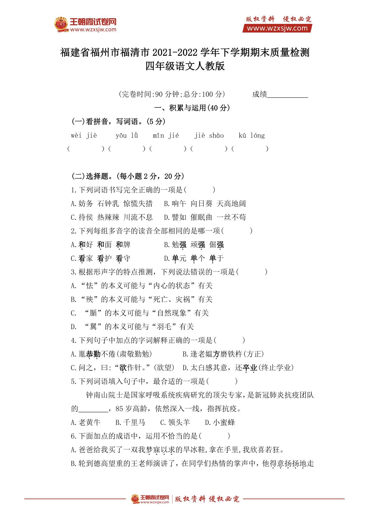 福建省福州市福清市2021-2022学年下学期期末质量检测四年级语文(人教版)