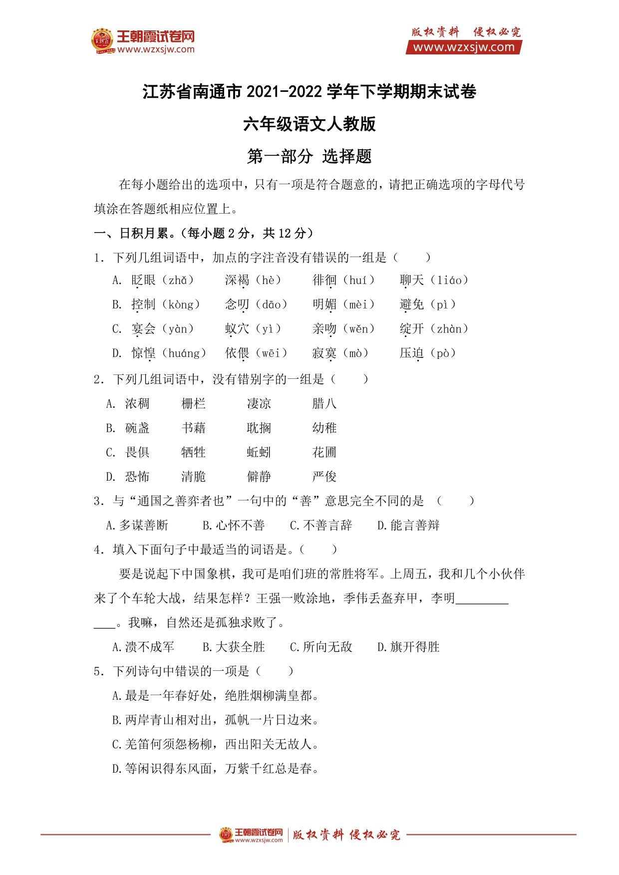 江苏省南通市2021-2022学年下学期期末试卷六年级语文(人教版)