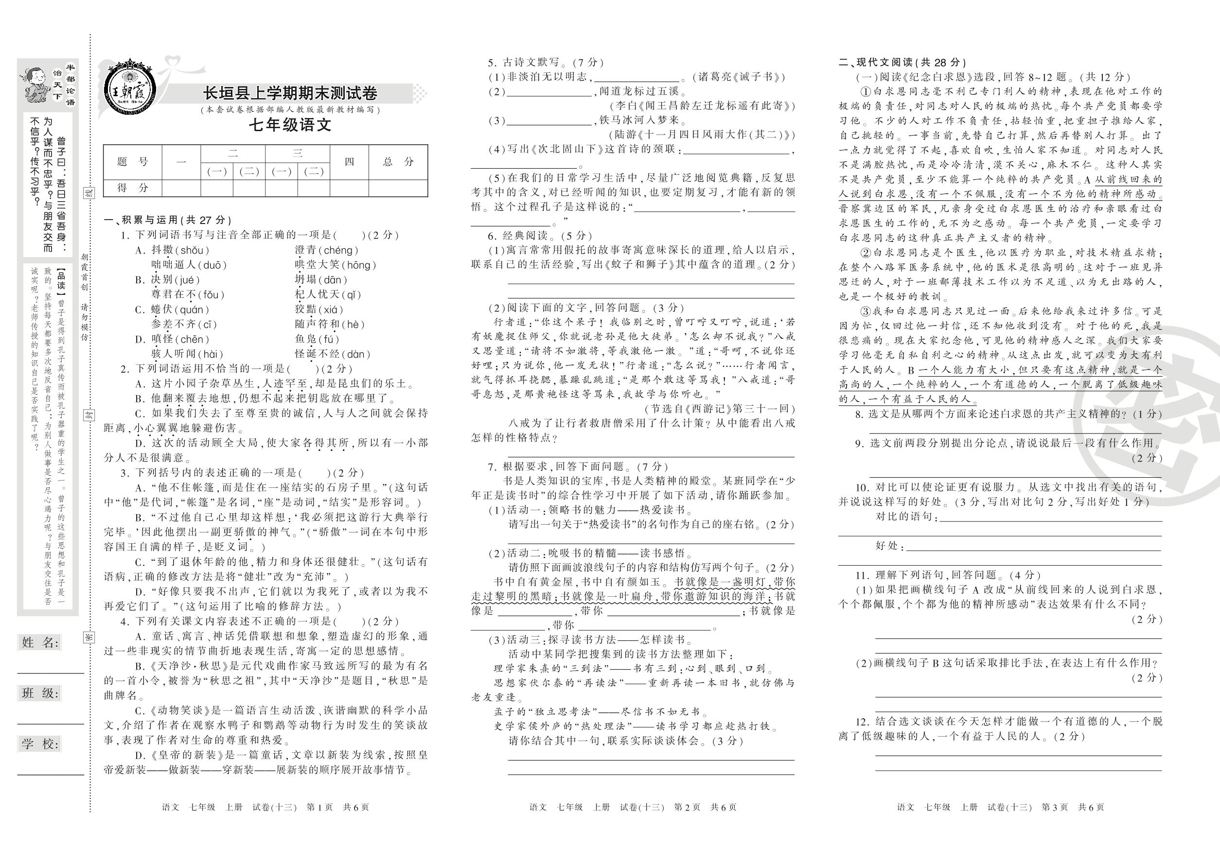 七年级语文人教版上册期末卷