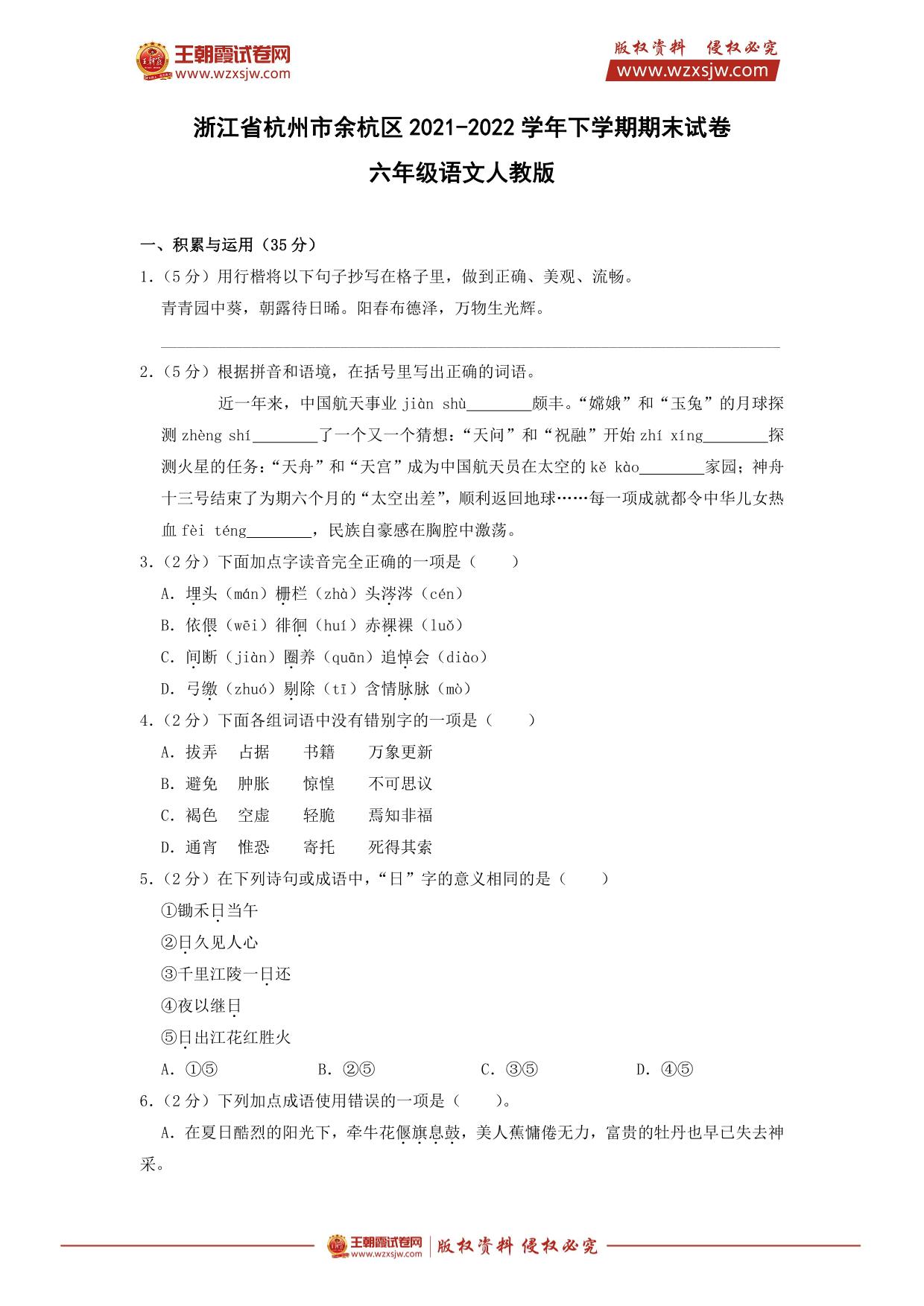 浙江省杭州市余杭区2021-2022学年下学期期末试卷六年级语文(人教版)