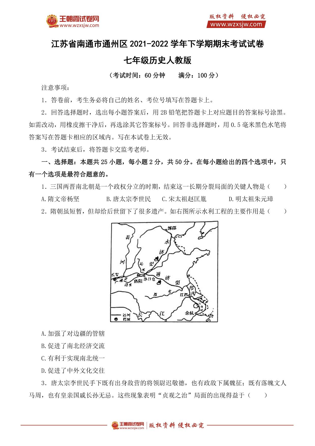 江苏省南通市通州区2021-2022学年下学期期末考试试卷七年级历史(人教版)