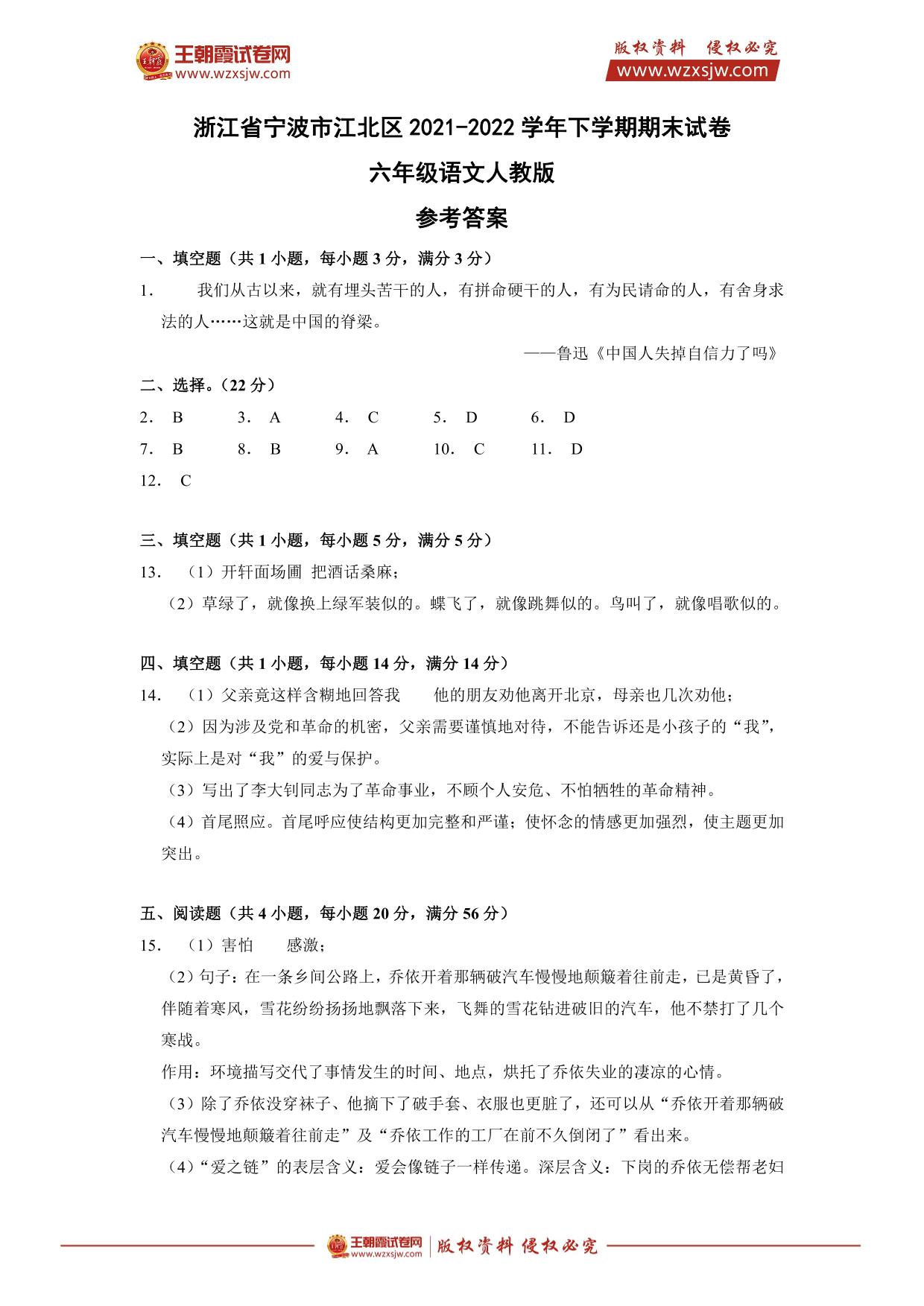 浙江省宁波市江北区2021-2022学年下学期期末试卷六年级语文(人教版)