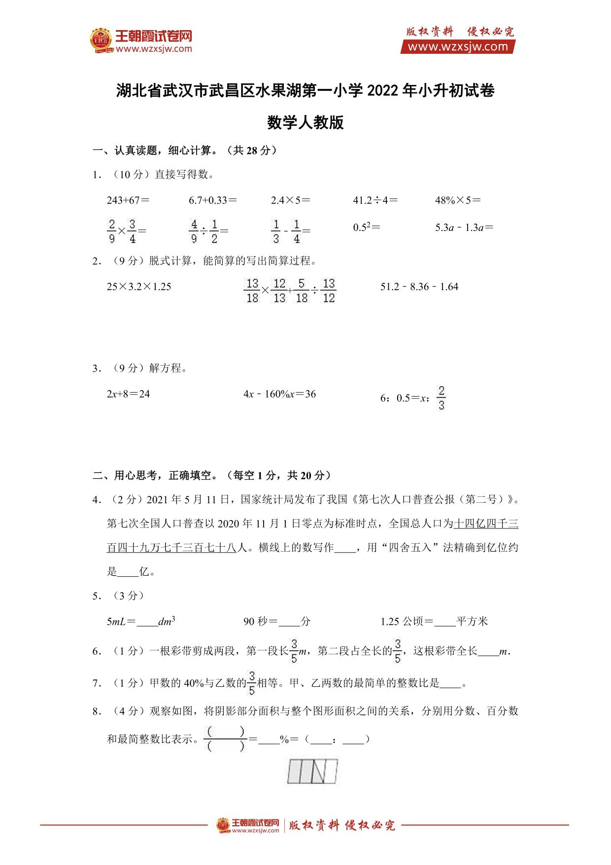 湖北省武汉市武昌区水果湖第一小学2022年小升初数学试卷(人教版)