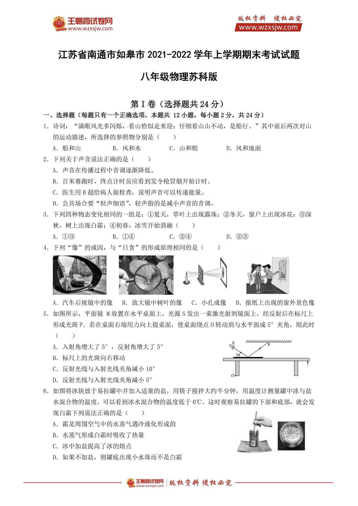 江苏省南通市如皋市2021-2022学年上学期期末考试试题八年级物理(苏科版)