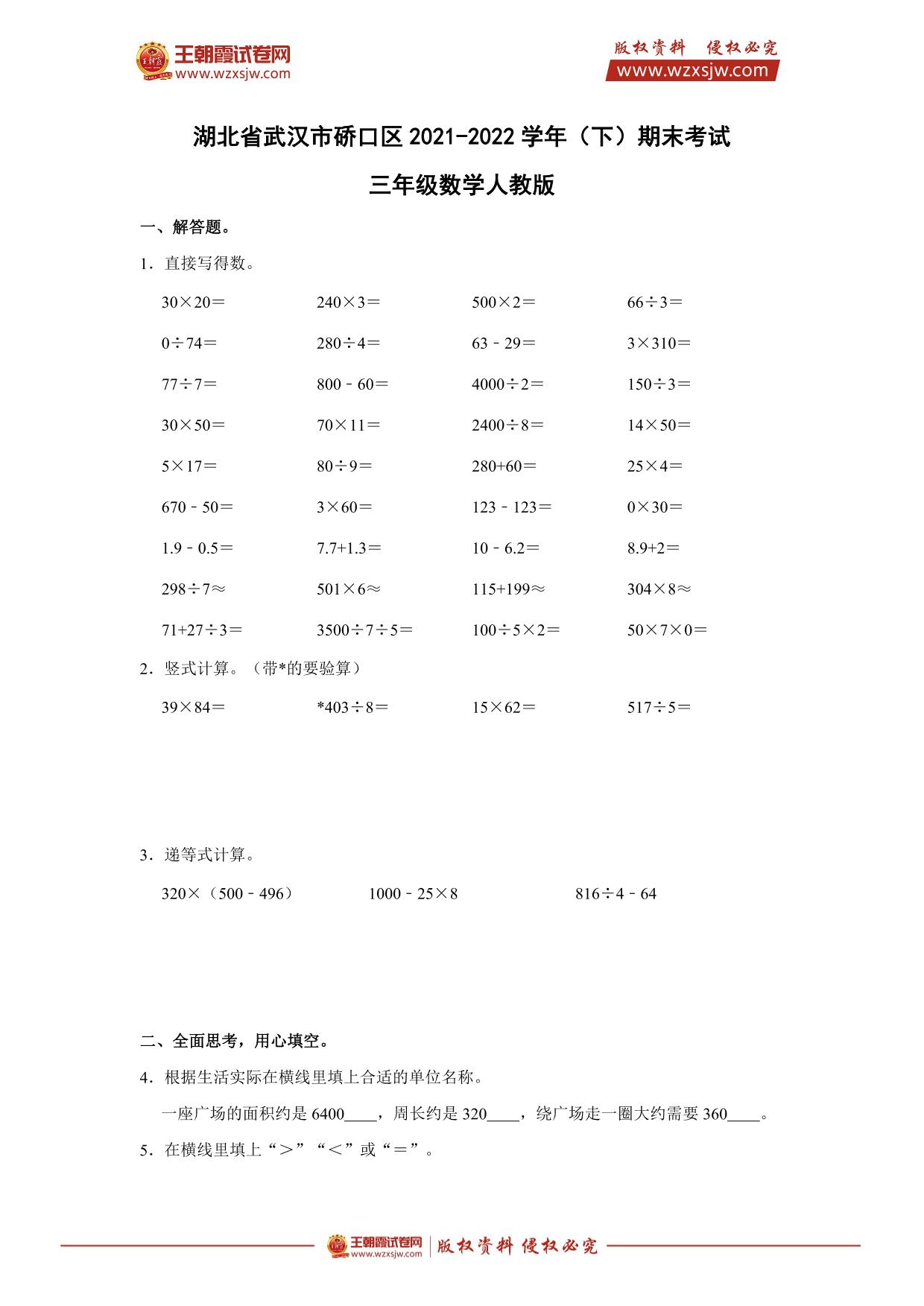 湖北省武汉市硚口区2021-2022学年(下)期末考试三年级数学(人教版)