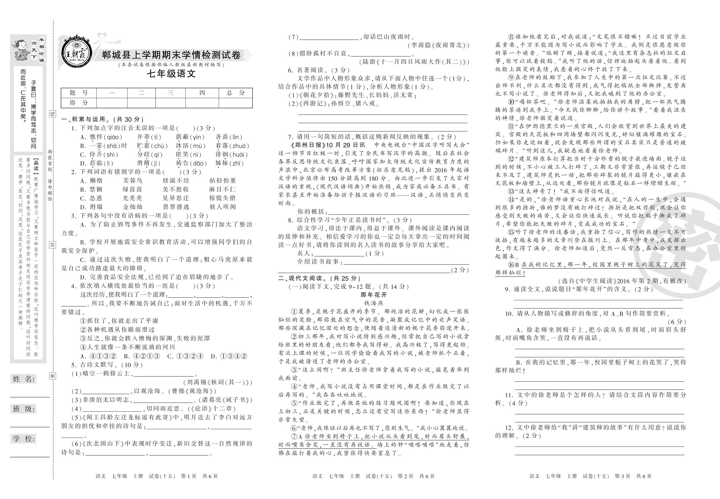 2016-2017学年第一学期周口市郸城县七年级语文试卷(人教版)【15】