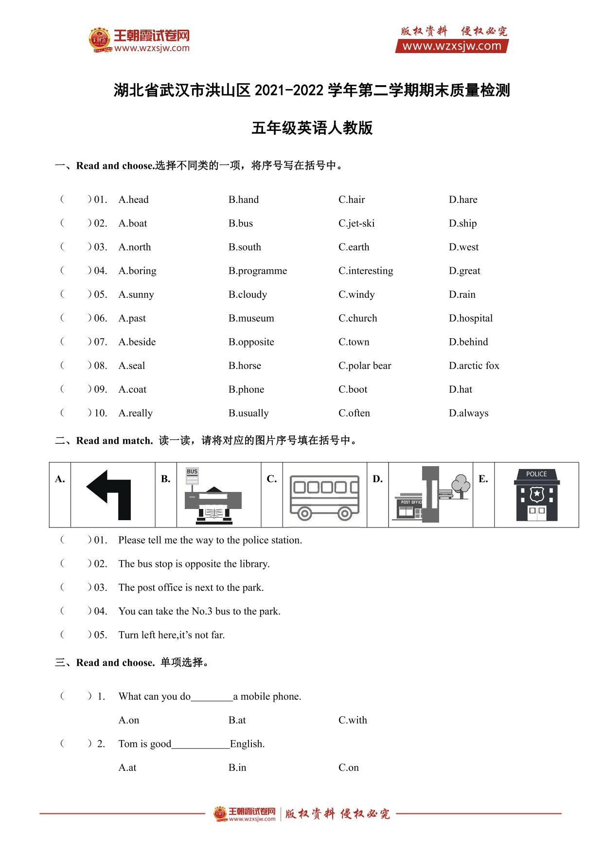 湖北省武汉市洪山区2021-2022学年第二学期期末质量检测五年级英语(人教版)【无听力音频】