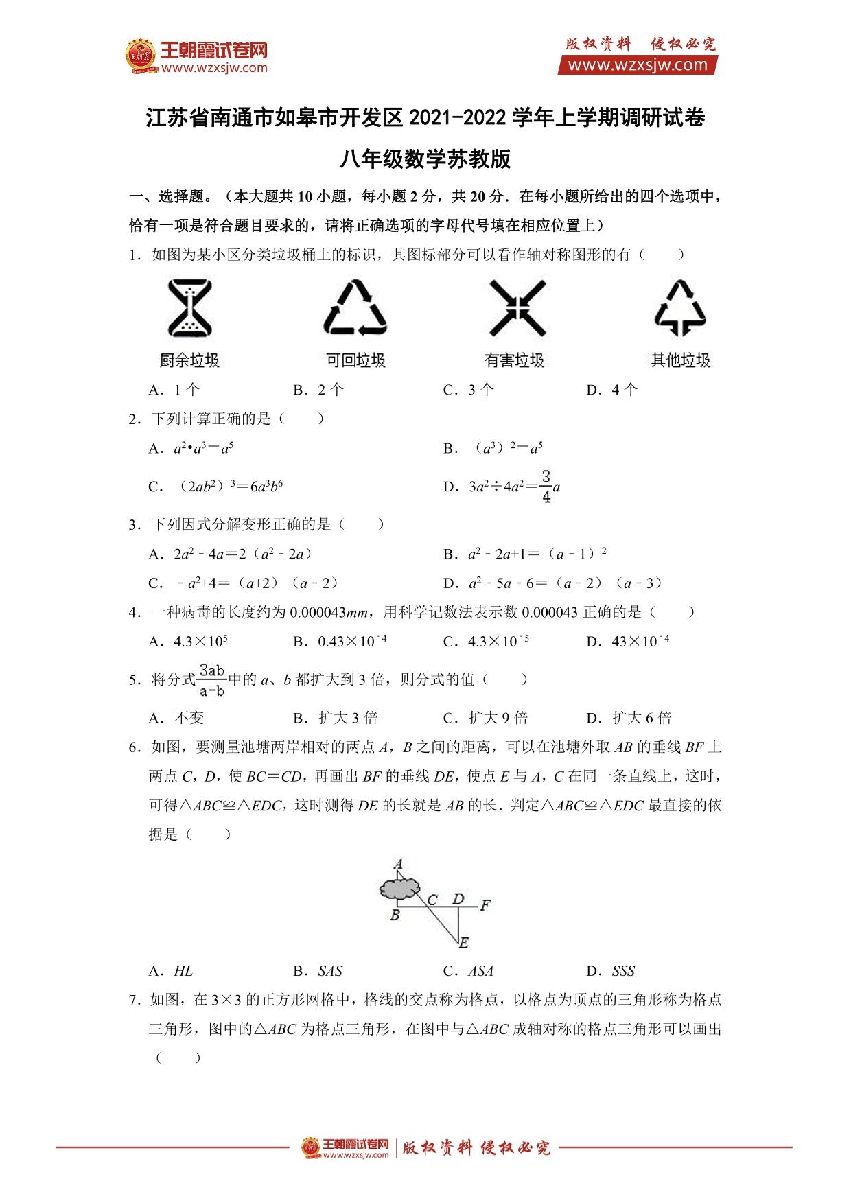 江苏省南通市如皋市开发区2021-2022学年上学期调研试卷八年级数学(苏教版)