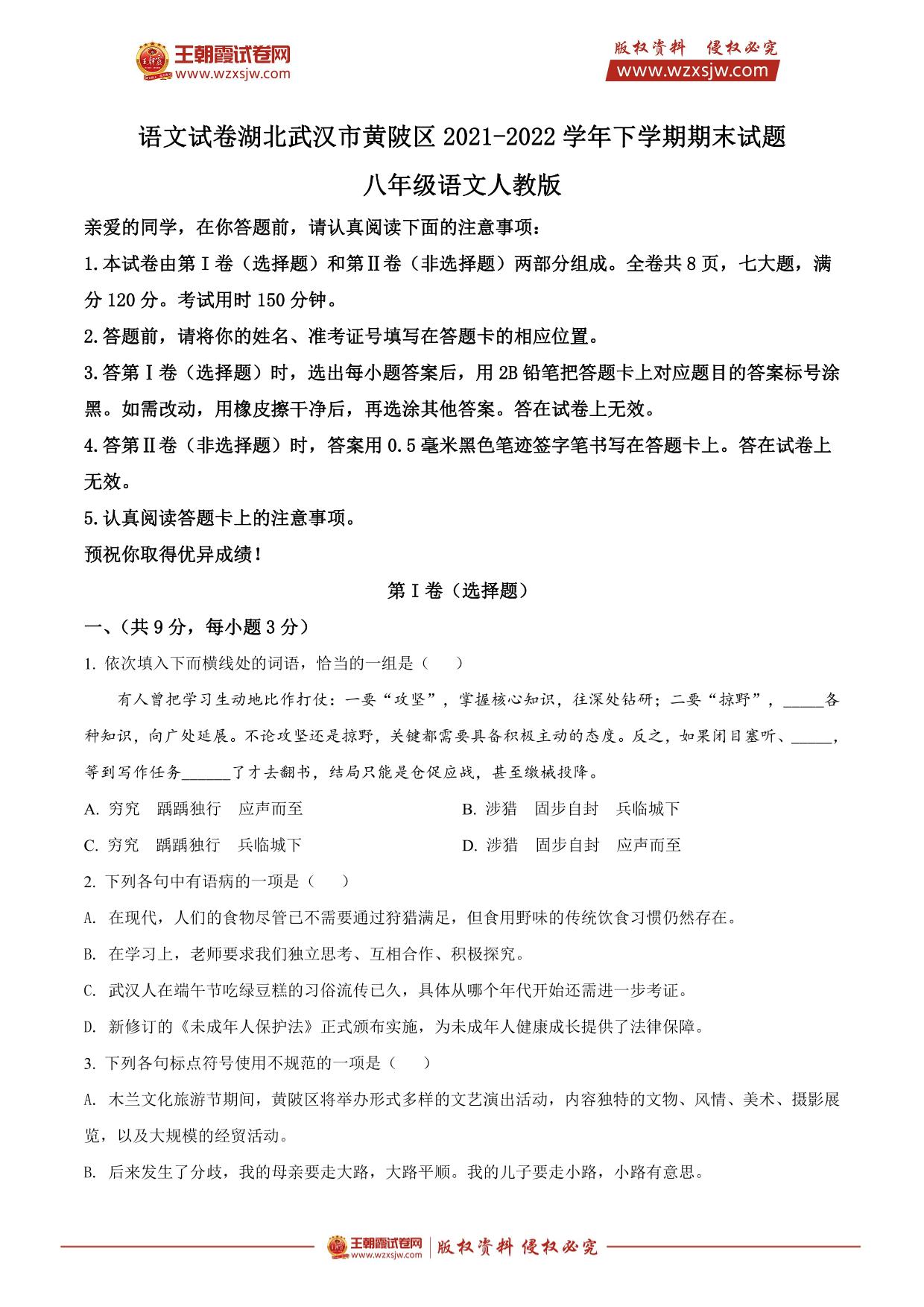 湖北武汉市黄陂区2021-2022学年下学期期末试题八年级语文(人教版)