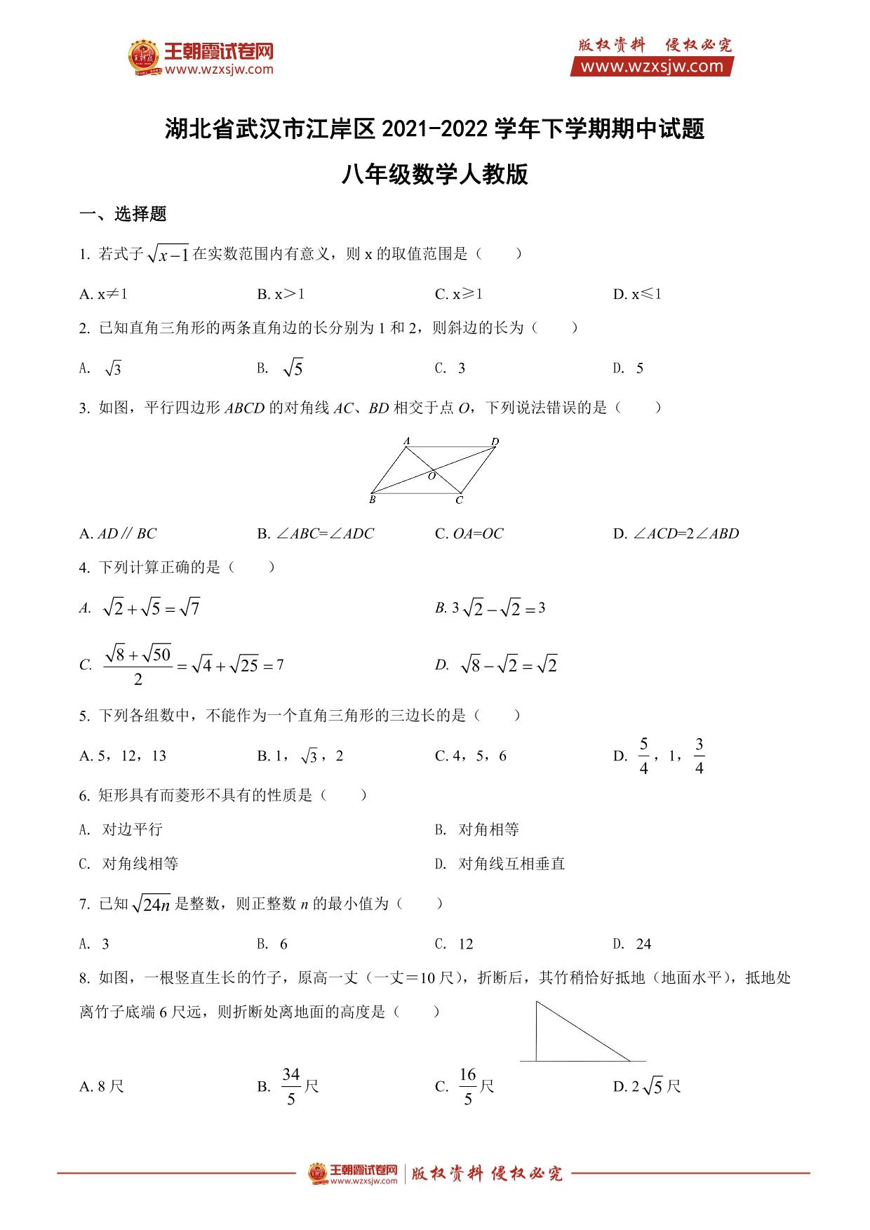 湖北省武汉市江岸区2021-2022学年下学期期中试题八年级数学(人教版)