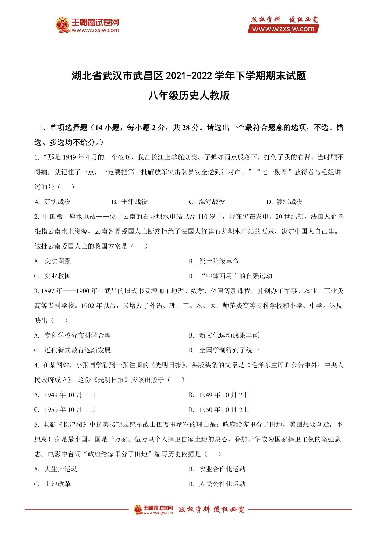 湖北省武汉市武昌区2021-2022学年下学期期末试题八年级历史(人教版)