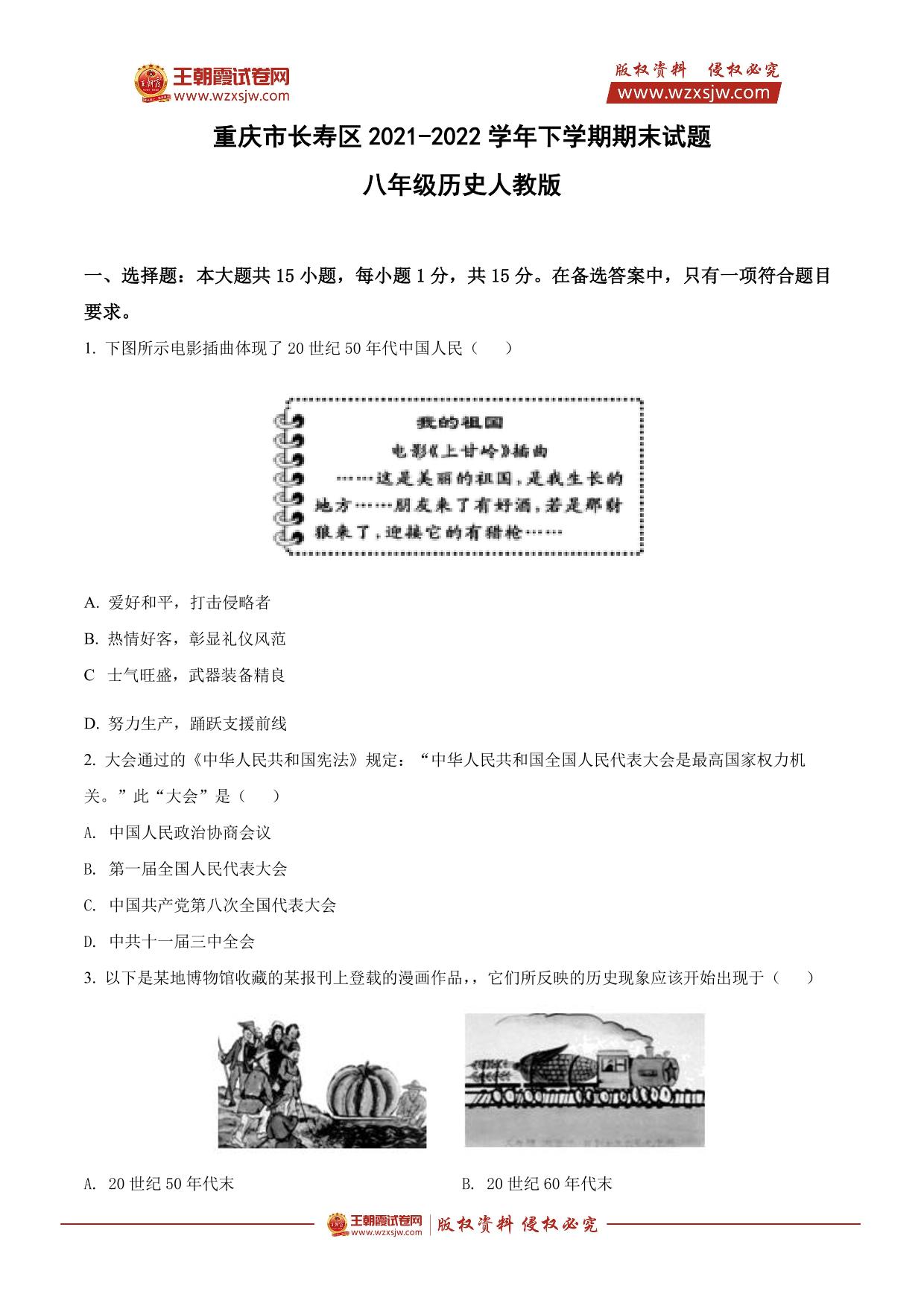 重庆市长寿区2021-2022学年下学期期末试题八年级历史(人教版)