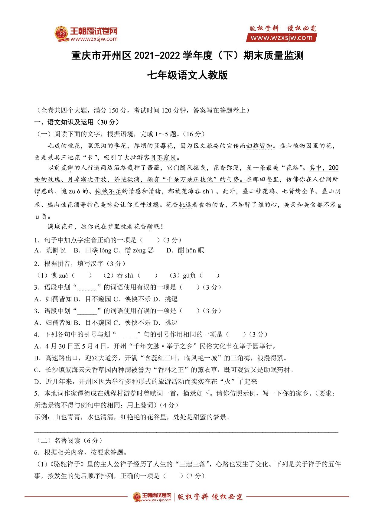 重庆市开州区2021-2022学年度(下)期末质量监测七年级语文(人教版)
