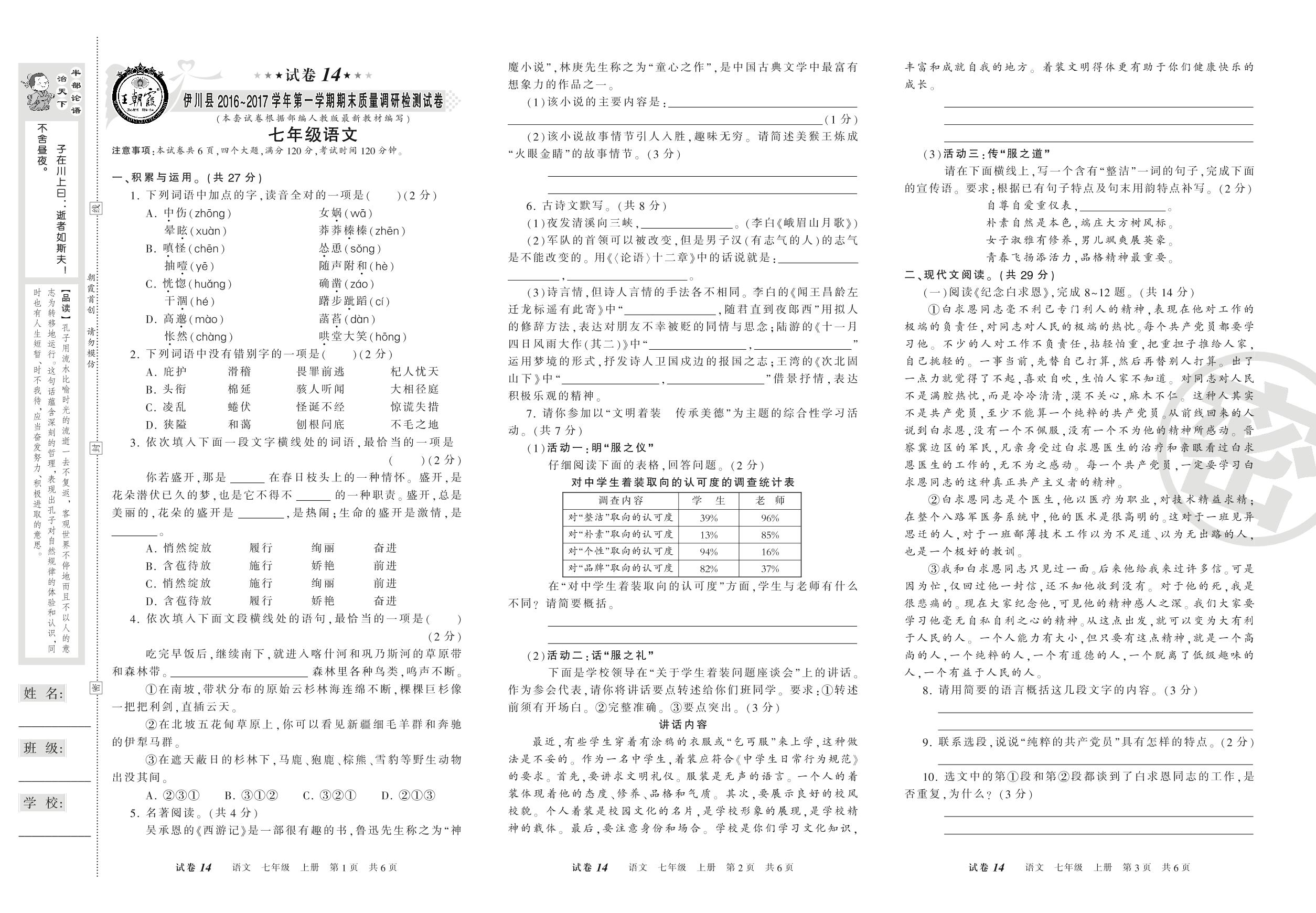 2016-2017学年第一学期洛阳市伊川县七年级语文试卷(人教版)【14】