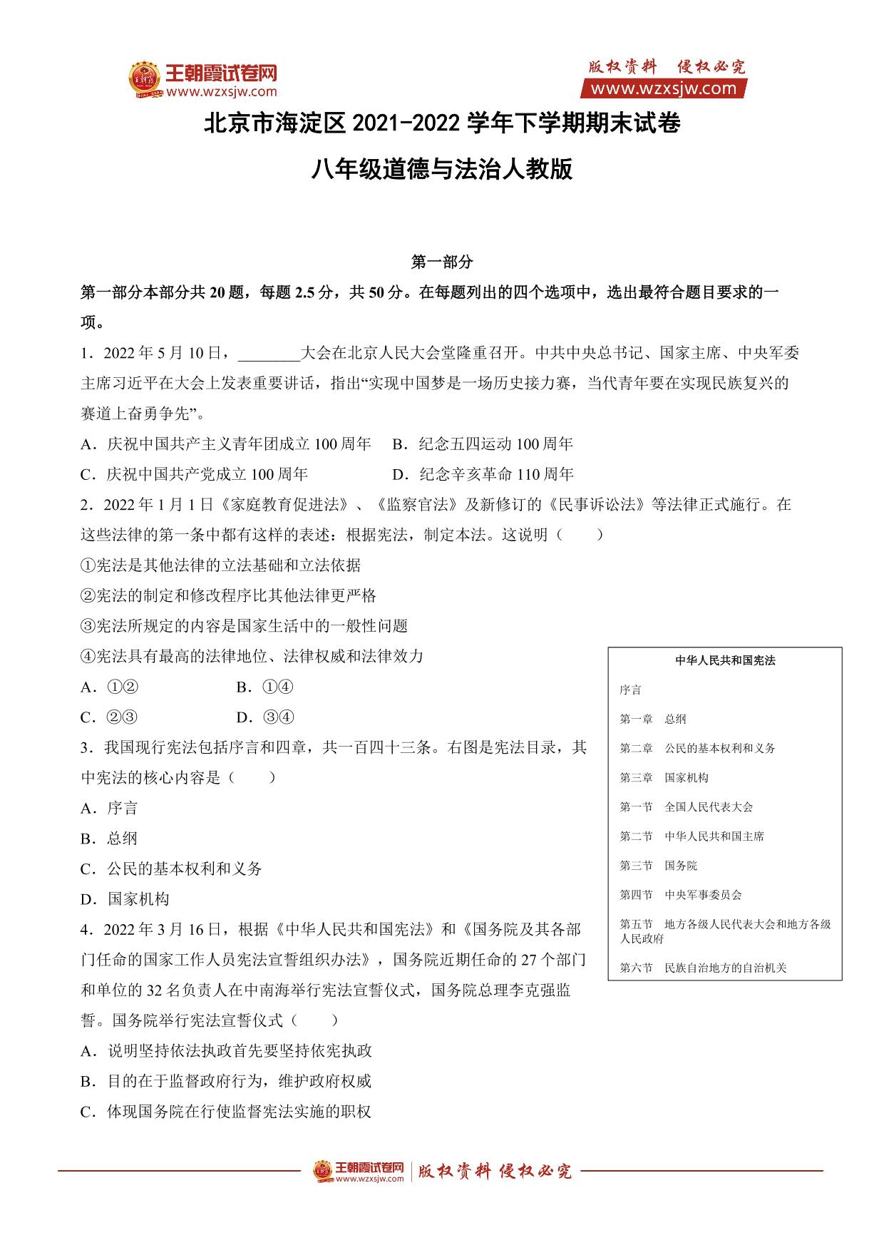 北京市海淀区2021-2022学年下学期期末试卷八年级道德与法治(人教版)