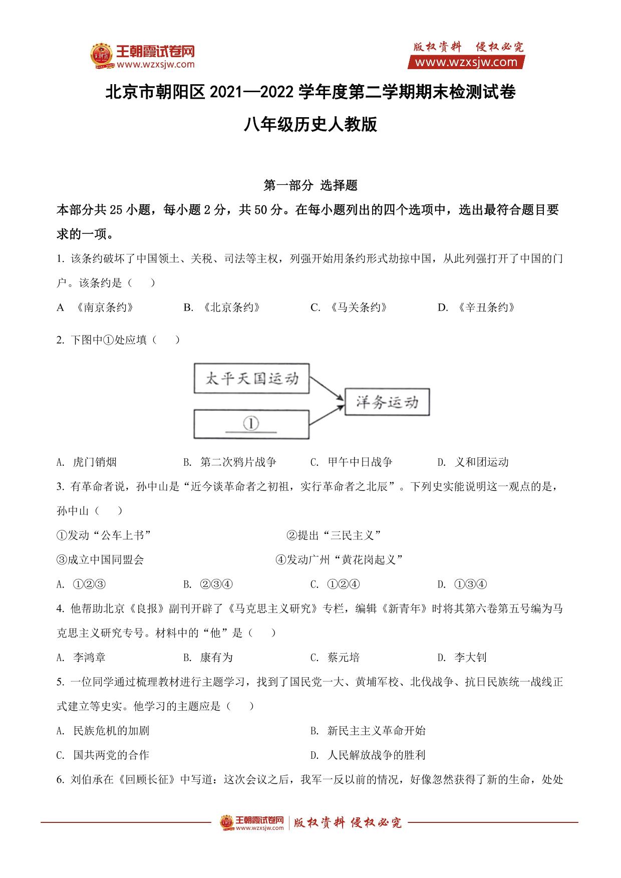 北京市朝阳区2021-2022学年度第二学期期末检测试卷八年级历史(人教版)