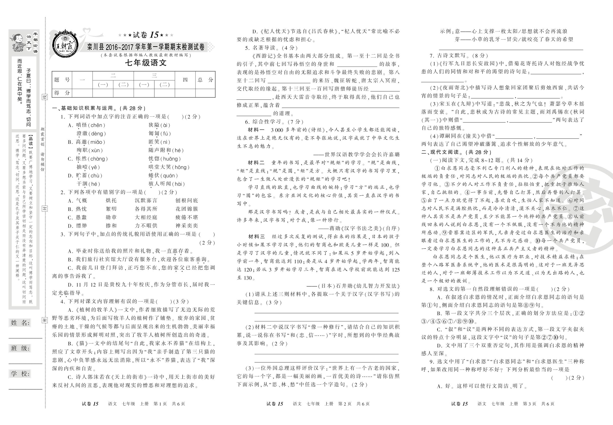 2016-2017学年第一学期洛阳市栾川县七年级语文试卷(人教版)【15】