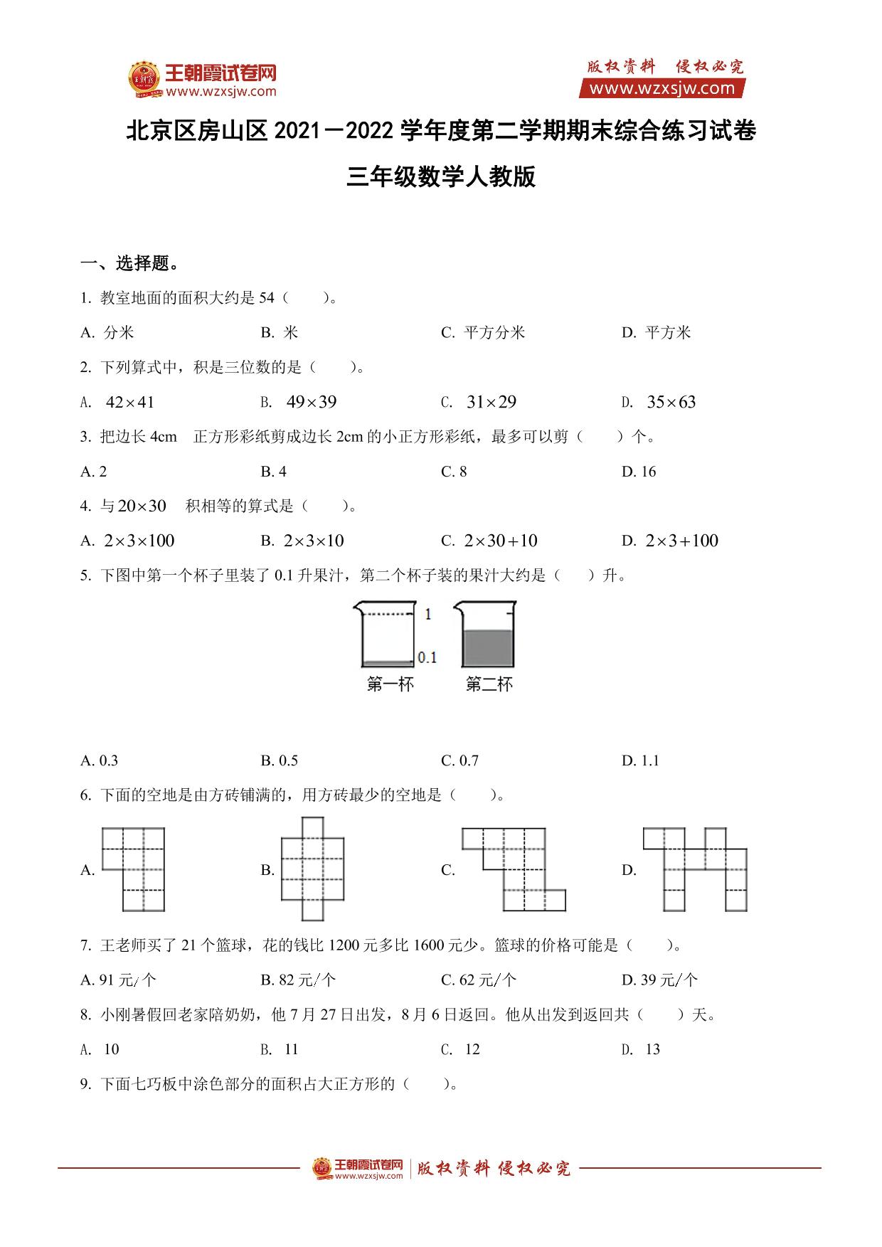 北京市房山区2021-2022学年度第二学期期末综合练习试卷三年级数学(人教版)