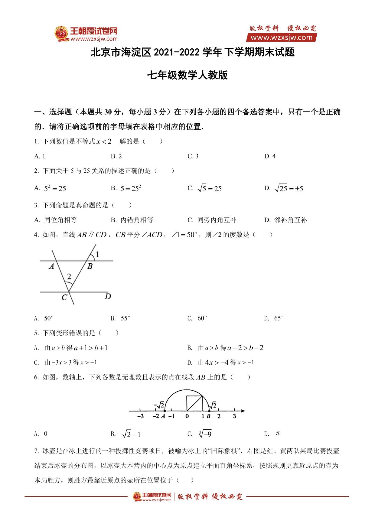 北京市海淀区2021-2022学年下学期期末试题七年级数学(人教版)