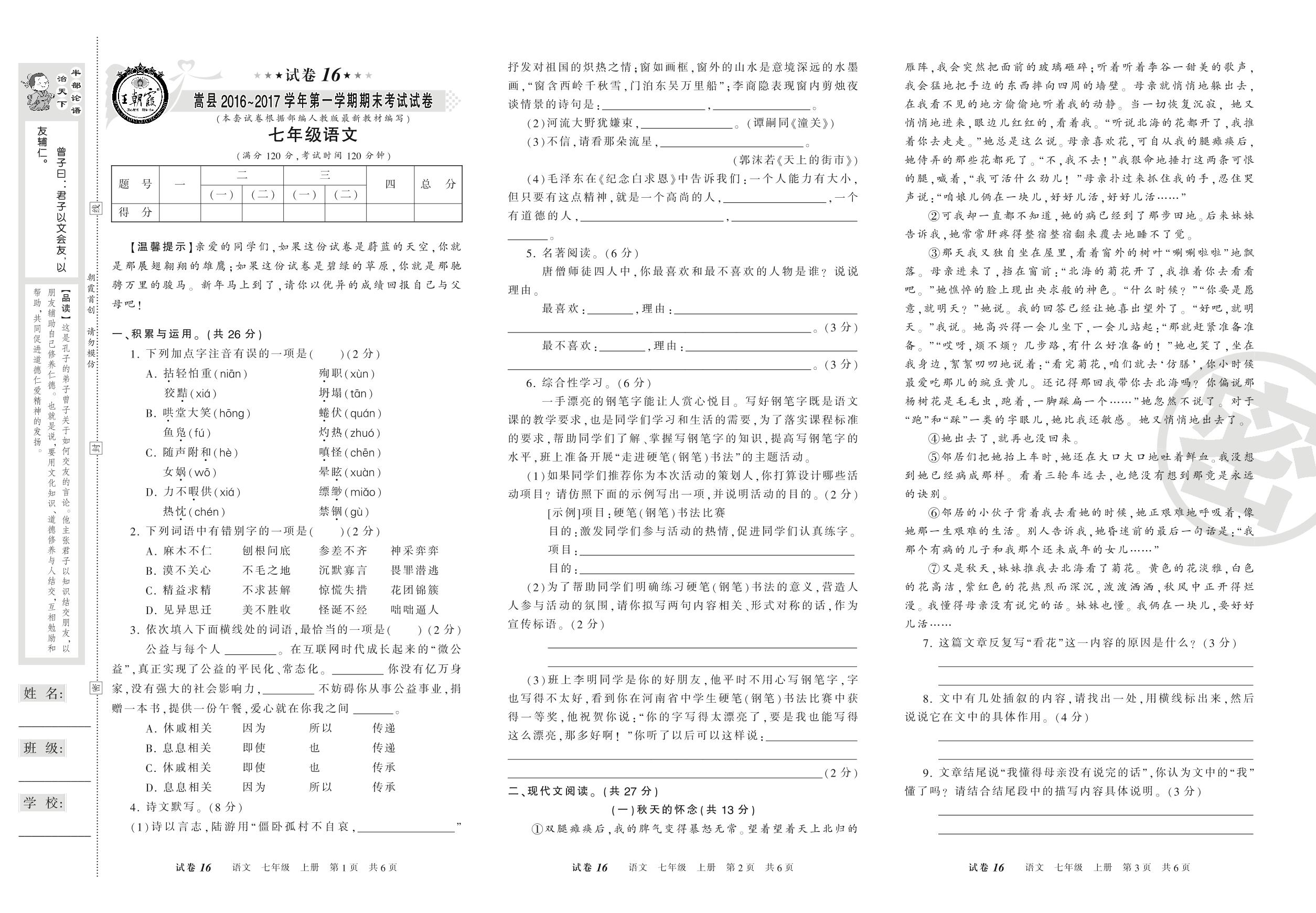 2016-2017学年第一学期洛阳市嵩县七年级语文试卷(人教版)【16】